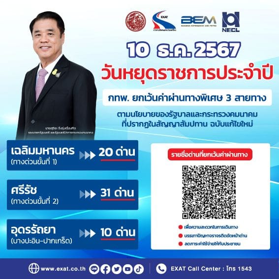 สำหรับยกเว้นค่าผ่านทางพิเศษครั้งนี้เป็นไปตามนโยบายของรัฐบาลและกระทรวงคมนาคม ที่ปรากฏในสัญญาสัมปทานฉบับแก้ไขใหม่ระหว่าง กทพ. บริษัท ทางด่วนและรถไฟฟ้ากรุงเทพ จำกัด (มหาชน) BEM) และบริษัททางด่วนกรุงเทพเหนือ จำกัด (NECL) เพื่อเป็นการอำนวยความสะดวกในการเดินทางของประชาชนในวันหยุดและช่วยลดภาระค่าใช้จ่ายให้แก่ประชาชน รวมทั้งช่วยลดปัญหาจราจรติดขัดบริเวณหน้าด่านเก็บค่าผ่านทางพิเศษอีกด้วย