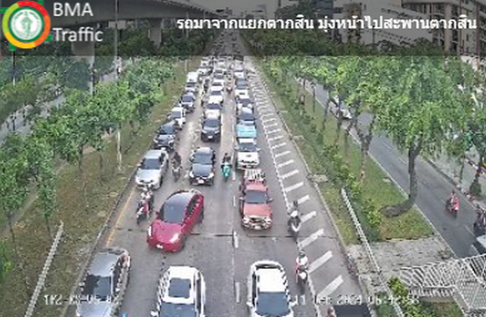 - สะพานสมเด็จพระเจ้าตากสิน ขาเข้า เริ่มหนาแน่นแล้ว ท้ายหน้าสินสาทร ทาวเวอร์