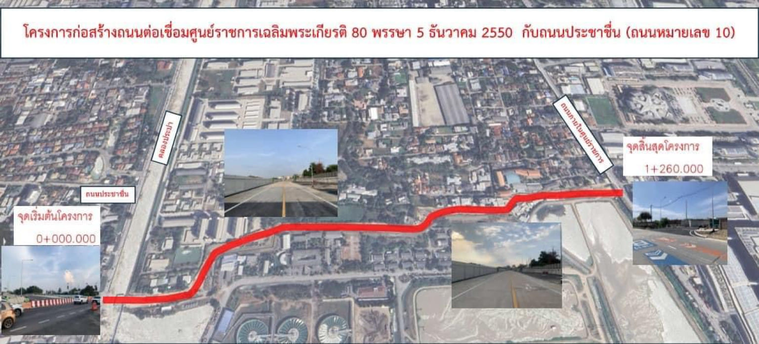 สำหรับถนนหมายเลข 10 เป็นถนนคอนกรีตเสริมเหล็กขนาด 2 ช่องจราจร มีจุดเริ่มต้นจากถนนประชาชื่น ข้ามคลองประปา ผ่านพื้นที่ของมณฑลทหารบกที่ 11 และพื้นที่ของ กปน. ข้ามคลองบางตลาด และจุดสิ้นสุดโครงการเชื่อมต่อกับถนนภายในศูนย์ราชการเฉลิมพระเกียรติฯ แจ้งวัฒนะ ระยะทางรวมทั้งโครงการประมาณ 1.3 กิโลเมตร ทั้งนี้ กปน. เตรียมปรับปรุงภูมิทัศน์บริเวณถนนเส้นดังกล่าว ด้วยการปลูกต้นรวงผึ้งและต้นเหลืองปรีดียาธรสร้างเป็นสวนสาธารณะเฉลิมพระเกียรติพระเจ้าอยู่หัว เนื่องในโอกาสมหามงคลเฉลิมพระชนมพรรษา 6 รอบ เพื่อสร้างอากาศบริสุทธิ์ให้แก่ประชาชนที่อาศัยอยู่บริเวณใกล้เคียงและผู้ที่สัญจรผ่าน ทั้งยังสามารถจัดกิจกรรมเพื่อสังคมในอนาคตได้