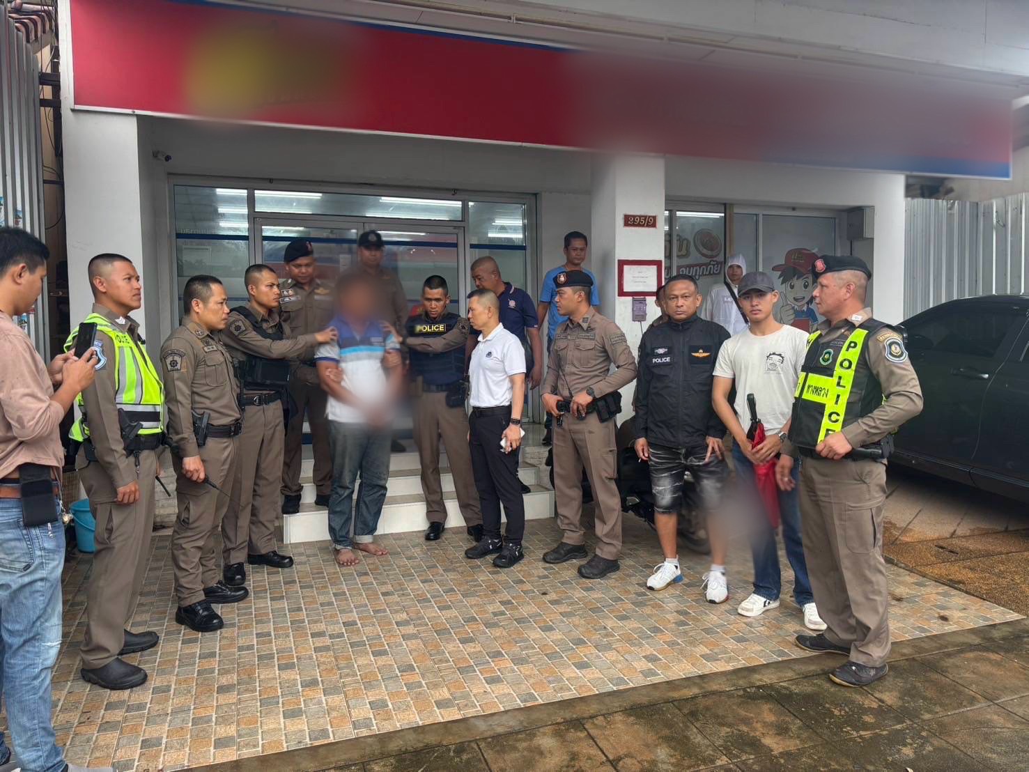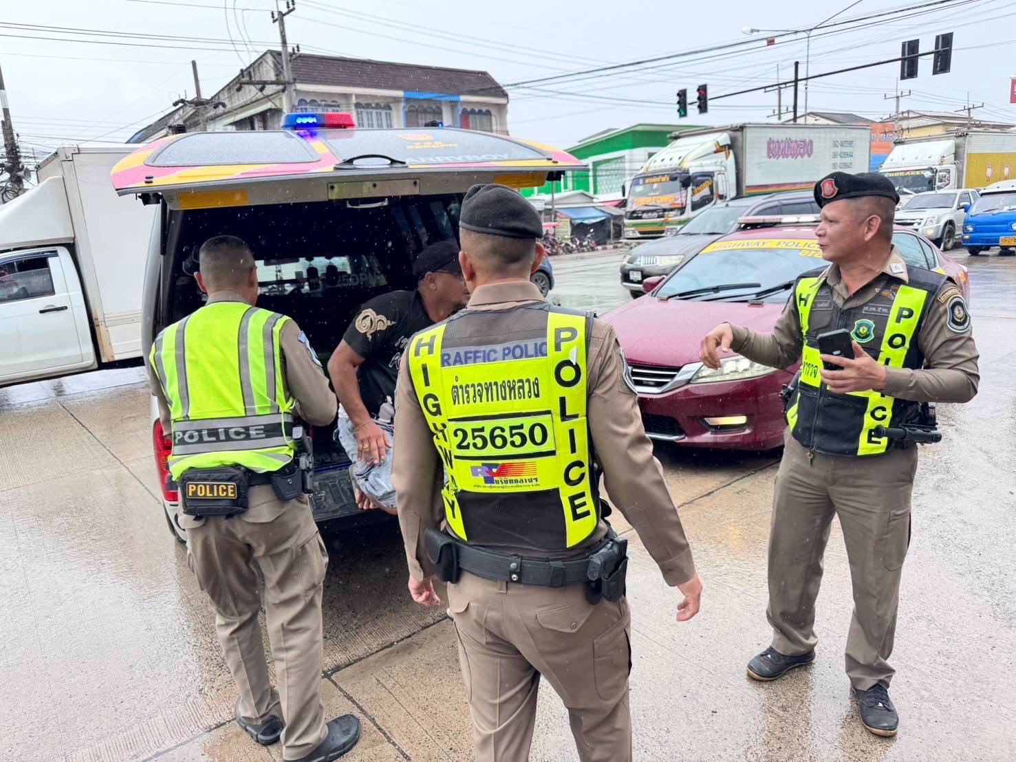 กองบังคับการตำรวจทางหลวง (บก.ทล.) โดย พล.ต.ต.คงกฤช เลิศสิทธิกุล ผบก.ทล. , พ.ต.อ.ภคพล สุชล ผกก.2 บก.ทล., พ.ต.ต.ปานเทพ พจน์ธีระมนตรี สว.ส.ทล.5 กก.2 บก.ทล. เจ้าหน้าที่ชุดจับกุม ส.ทล.5 กก.2 บก.ทล. ร่วมกันจับกุม นาย กร (นามสมมุติ) อายุ 27 ปี โดยกล่าวหาว่ากระทำความผิดฐาน หน่วงเหนี่ยวหรือกักขังผู้อื่น หรือกระทำด้วยประการใดให้ผู้อื่นปราศจากเสรีภาพในร่างกาย , ข่มขืนใจผู้อื่นให้กระทำการใด ไม่กระทำการใด หรือจำยอมต่อสิ่งใด โดยทำให้กลัวว่าจะเกิดอันตรายต่อชีวิต ร่างกาย เสรีภาพ ชื่อเสียงหรือทรัพย์สินของผู้ถูกข่มขืนใจนั้นเองหรือของผู้อื่น หรือโดยใช้กำลังประทุษร้ายจนผู้ถูกข่มขืนใจต้องกระทำการนั้น ไม่กระทำการนั้นหรือจำยอมต่อสิ่งนั้น , เสพยาเสพติดให้โทษประเภท 1 (เมทแอมเฟตามีน) โดยฝ่าฝืนต่อกฎหมาย และ เป็นผู้ขับขี่เสพยาเสพติดให้โทษโดยฝ่าฝืนต่อกฎหมาย” จับกุมได้ริมถนนสุราษฎร์ธานี-นครศรีธรรมราช หน้าเทศบาลตำบลท่าทองใหม่ ต.ท่าทองใหม่ อ.กาญจนดิษฐ์ จ.สุราษฎร์ธานี ต่อเนื่องศูนย์ปฏิบัติการสืบสวน สภ.เมืองสุราษฎร์ธานี ต.ตลาด อ.เมือง จ.สุราษฎร์ธานี และโรงพยาบาลสุราษฎร์ธานี