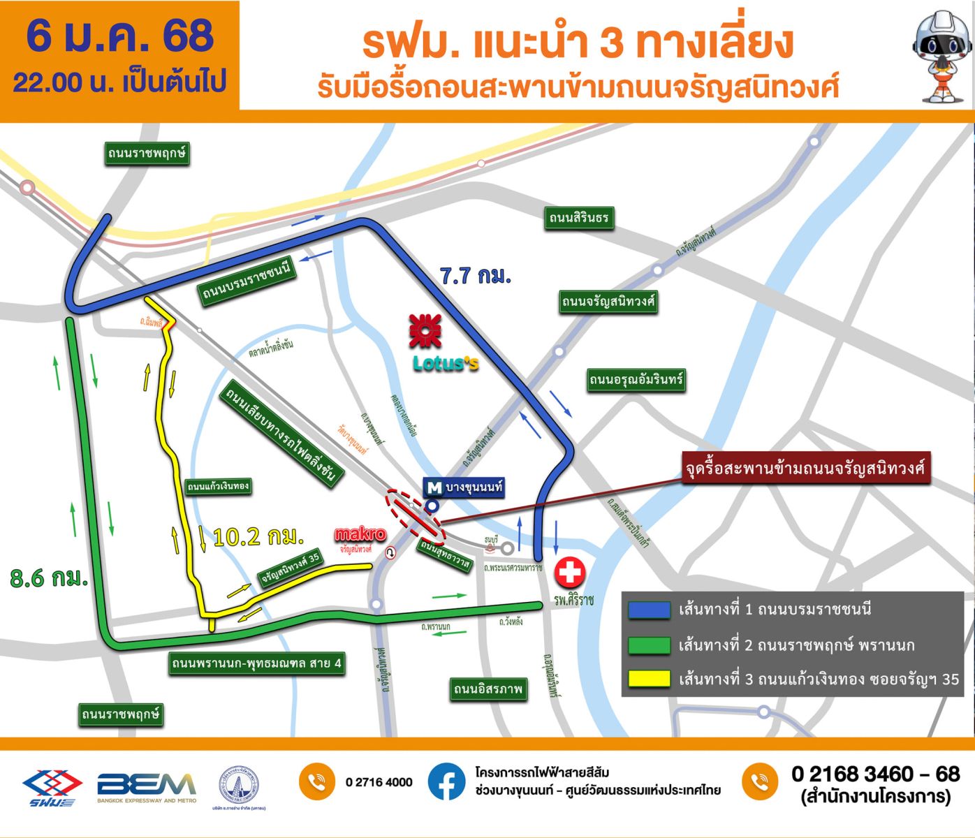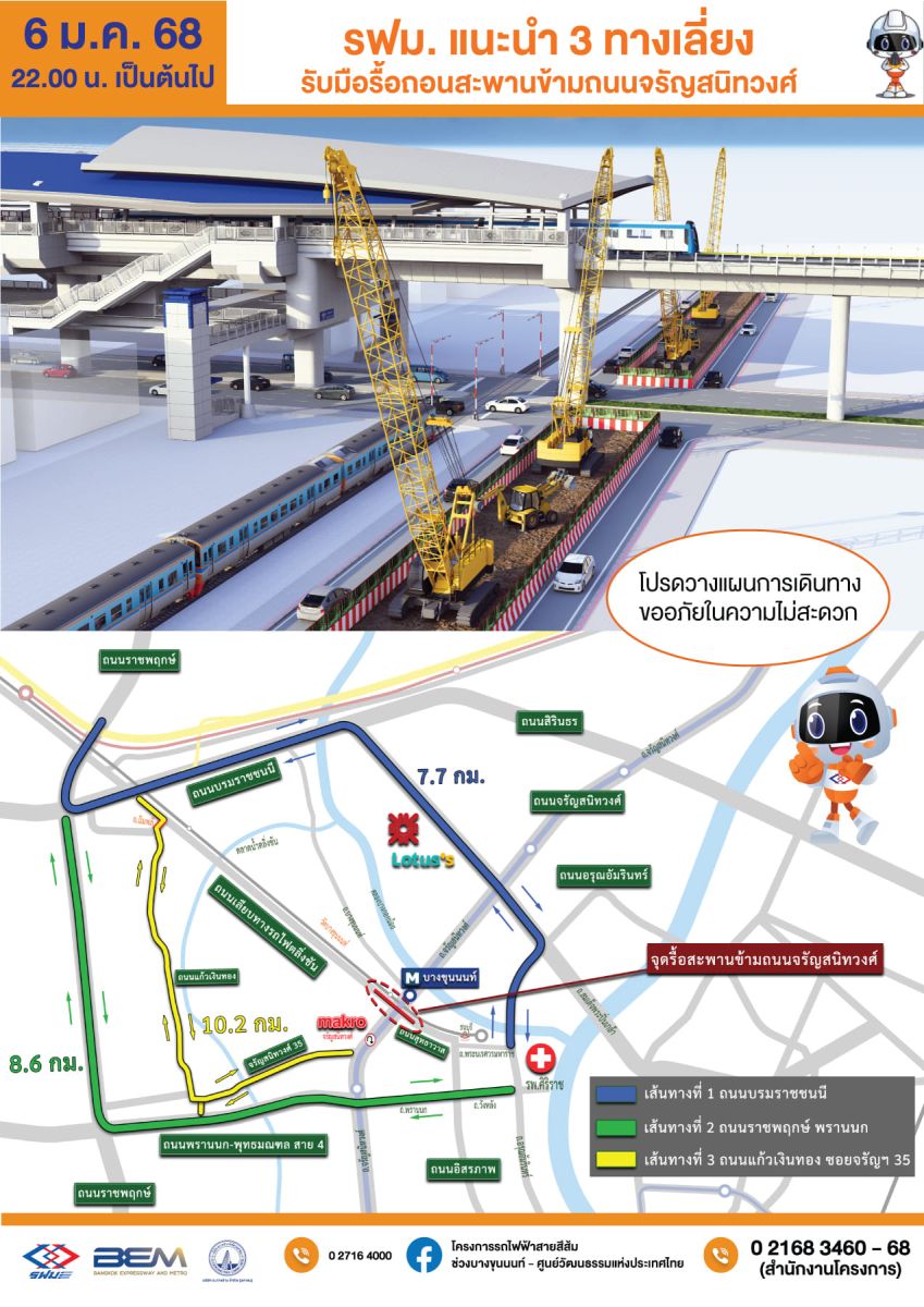 รฟม. แนะนำ 3 ทางเลี่ยง รับมือรื้อถอนสะพานข้ามถนนจรัญสนิทวงศ์ 6 มกราคม 2568 เพื่อก่อสร้างโครงการรถไฟฟ้าสายสีส้ม ช่วงบางขุนนนท์ - ศูนย์วัฒนธรรมแห่งประเทศไทย