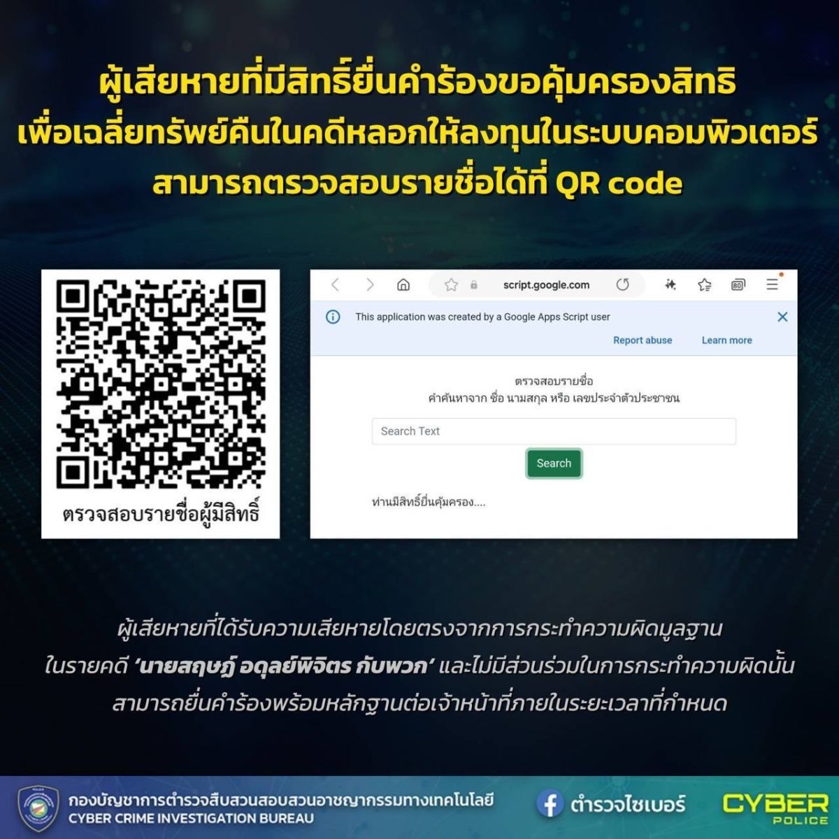 ผู้เสียหายที่ได้รับความเสียหายโดยตรงจากคดีดังกล่าวและไม่มีส่วนร่วมในการกระทำความผิด สามารถตรวจสอบสิทธิ์โดยค้นหารายชื่อตนเองได้ผ่าน QR Code ที่แนบมานี้