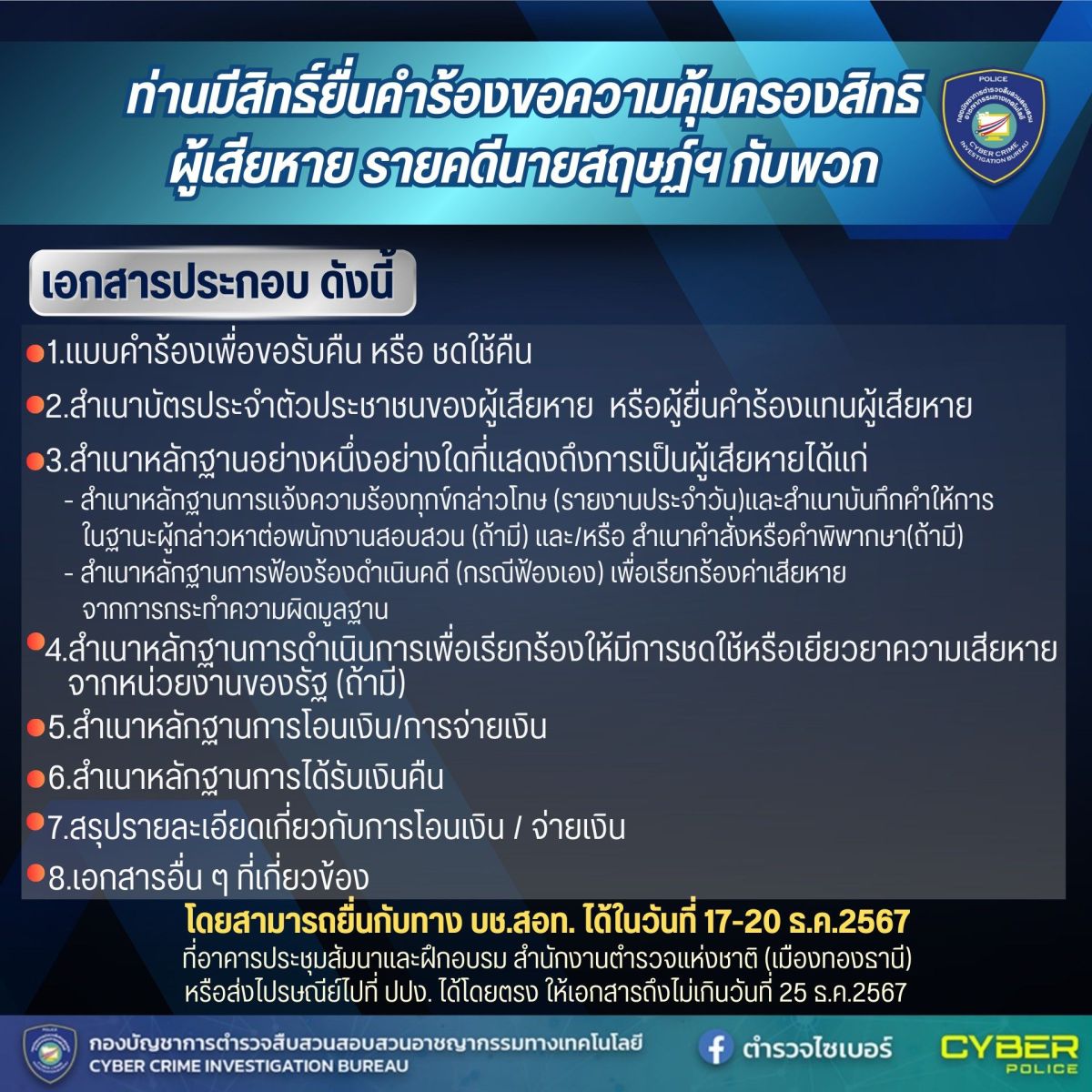 สำหรับผู้มีสิทธิ์ยื่นขอเฉลี่ยทรัพย์คืนในคดีดังกล่าว ให้เตรียมเอกสารประกอบเพื่อมายื่น ในวันที่ 17 - 20 ธ.ค.67 ณ อาคารประชุมสัมมนาและฝึกอบรม สำนักงานตำรวจแห่งชาติ (เมืองทองธานี) ดังนี้