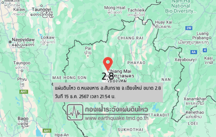 เวลา 21.54 น. วันที่ 15 ธันวาคม 2567 กองเฝ้าระวังแผ่นดินไหว กรมอุตุนิยมวิทยา แจ้งเหตุ แผ่นดินไหว ขนาด 2.8 ความลึก 2 กม. ภายในพื้นที่ของ ต.หนองหาร อ.สันทราย จ.เชียงใหม่ (18.92°N,99.04°E) มีรายงานว่า สามารถรับรู้ได้ถึงแรงสั่นสะเทือนในพื้นที่ อ.สันทราย และ อ.ดอยสะเก็ด