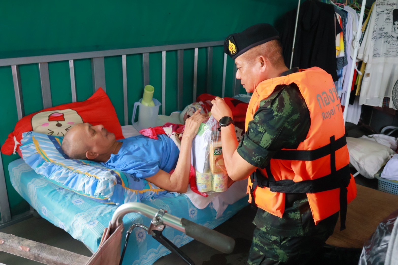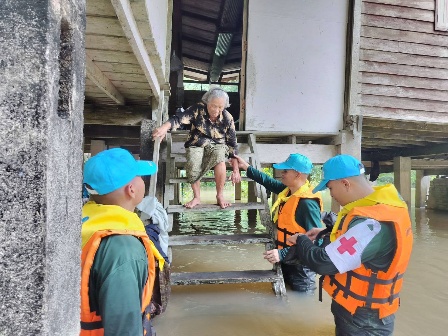 ในขณะเดียวกัน ศูนย์บรรเทาสาธารณภัย กรมทหารราบที่ 15 ได้ลงพื้นที่ ตำบลอินคีรี อำเภอพรหมคีรี จังหวัดนครศรีธรรมราช เพื่อช่วยเหลือ นางนิตยา สานุกูล อายุ 65 ปี ผู้ป่วยติดเตียงจากภาวะกระดูกทับเส้นประสาท โดยเจ้าหน้าที่ได้เคลื่อนย้ายผู้ป่วยไปยัง ศูนย์พักพิงชั่วคราวโรงเรียนบ้านโทเอก อย่างปลอดภัย พร้อมทั้งช่วยขนย้ายสิ่งของของประชาชนในพื้นที่อีก 28 ครัวเรือน เพื่อป้องกันความเสียหายเพิ่มเติมจากระดับน้ำที่ยังคงเพิ่มสูงขึ้น