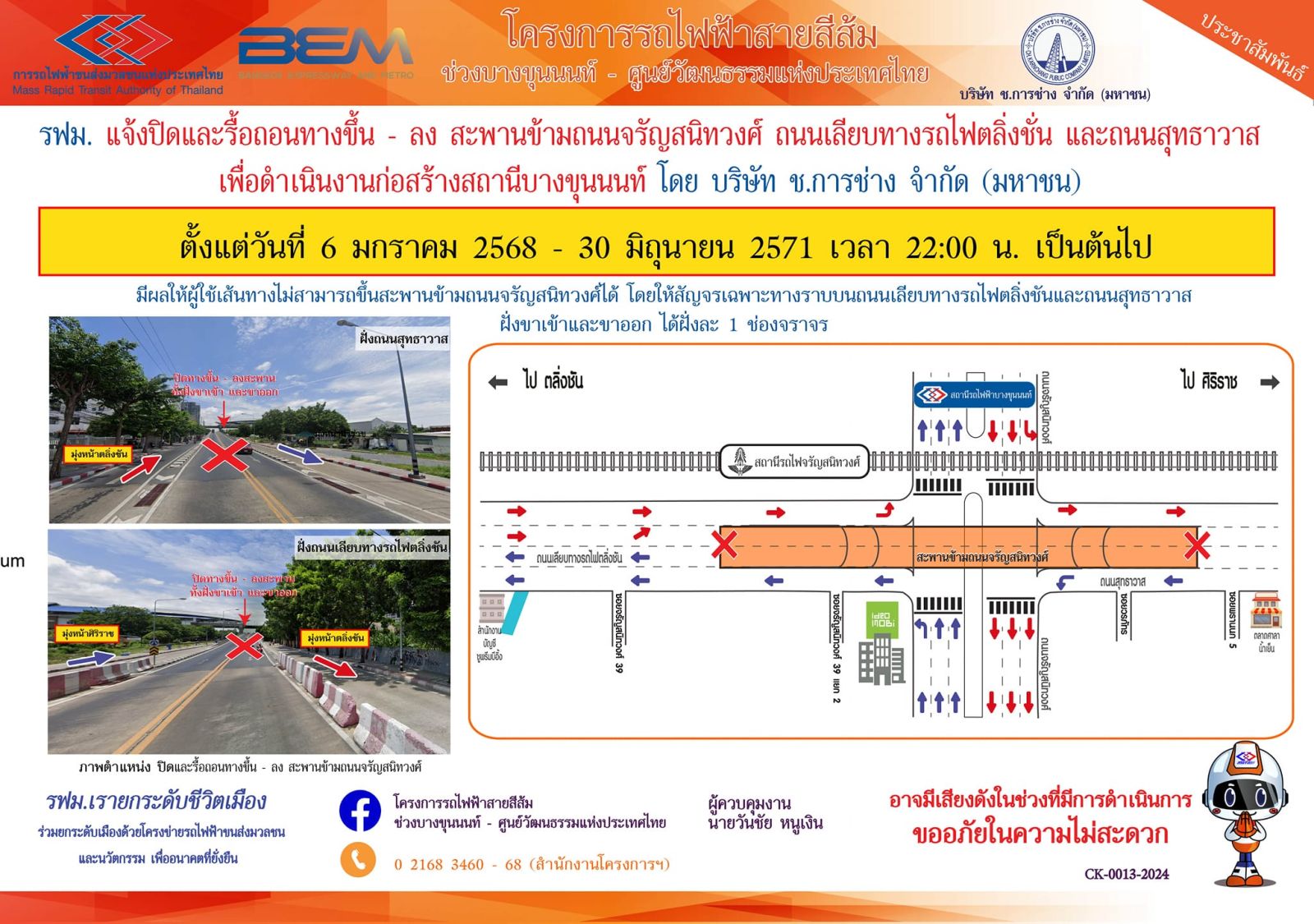 รฟม. แจ้งปิดและรื้อถอนทางขึ้น - ลง สะพานข้ามถนนจรัญสนิทวงศ์ ถนนเลียบทางรถไฟตลิ่งชั่น และถนนสุทธาวาส เพื่อดำเนินงานก่อสร้างสถานีบางขุนนนท์ โครงการรถไฟฟ้าสายสีส้ม ช่วงบางขุนนนท์ - ศูนย์วัฒนธรรมแห่งประเทศไทย ตั้งแต่วันที่ 6 มกราคม 2568 - 30 มิถุนายน 2571 เวลา 22.00 น. เป็นต้นไป