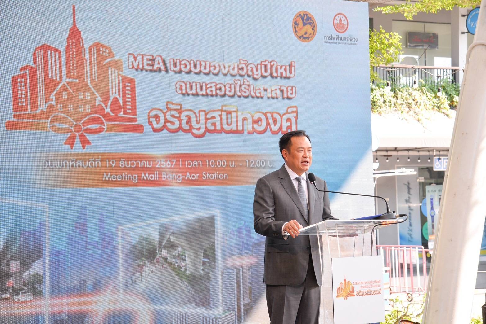 วันนี้ (19 ธันวาคม 2567) นายอนุทิน ชาญวีรกูล รองนายกรัฐมนตรี และรัฐมนตรีว่าการกระทรวงมหาดไทย เป็นประธานงาน “MEA มอบของขวัญปีใหม่ ถนนสวยไร้เสาสายจรัญสนิทวงศ์” พร้อมด้วย นายอรรษิษฐ์ สัมพันธรัตน์ ปลัดกระทรวงมหาดไทย นายขจร ศรีชวโนทัย รองปลัดกระทรวงมหาดไทย ในฐานะประธานกรรมการ MEA หรือการไฟฟ้านครหลวง นายเชษฐา โมสิกรัตน์ รองปลัดกระทรวงมหาดไทย รศ.ดร.วิศณุ ทรัพย์สมพล รองผู้ว่าราชการกรุงเทพมหานคร ผู้อำนวยการส่วนสิทธิแห่งทาง คณะกรรมการกิจการกระจายเสียง กิจการโทรทัศน์ และกิจการโทรคมนาคมแห่งชาติ (สำนักงาน กสทช.) ผู้ช่วยกรรมการผู้จัดการใหญ่ บริษัท โทรคมนาคมแห่งชาติ จำกัด (มหาชน) หรือ NT ร่วมด้วยผู้แทนจากสำนักงานตำรวจแห่งชาติ สำนักงานคณะกรรมการป้องกันและปราบปรามการทุจริตในภาครัฐ สำนักงานคณะกรรมการป้องกันและปราบปรามการทุจริตแห่งชาติ และคณะกรรมการ MEA โดยมี นายวิลาศ เฉลยสัตย์ ผู้ว่าการ MEA กล่าวรายงานผลความสำเร็จในโอกาสมอบของขวัญปีใหม่ 2568 ด้วยโครงการนำสายไฟฟ้าลงใต้ดินให้กับประชาชน ณ ลานแขกแพ Meeting Mall บางอ้อ สเตชัน ถนนจรัญสนิทวงศ์