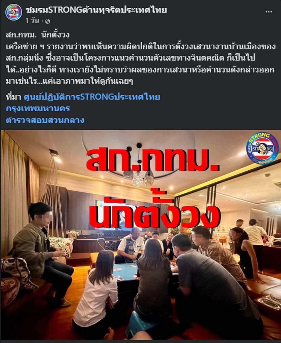 19 ธันวาคม 2567 จากกรณี "ชมรม STRONG ต้านทุจริตประเทศไทย" โพสต์ภาพกลุ่มบุคคลประมาณ 9-10 คน กำลังนักล้อมวง ระบุข้อความว่า “สก.กทม.นักตั้งวง เครือข่ายฯ รายงานว่าพบเห็นความผิดปกติในการตั้งวงเสวนางานบ้านเมืองของ สก.กลุ่มหนึ่ง ซึ่งอาจเป็นโครงการแนวคำนวณตัวเลขทางจินตคณิต ก็เป็นไปได้ อย่างไรก็ดี ทางเรายังไม่ทราบว่าผลของการเสวนาหรือคำนวณดังกล่าวออกมาอย่างไร แค่เอาภาพมาให้ดูกันเฉยๆ”