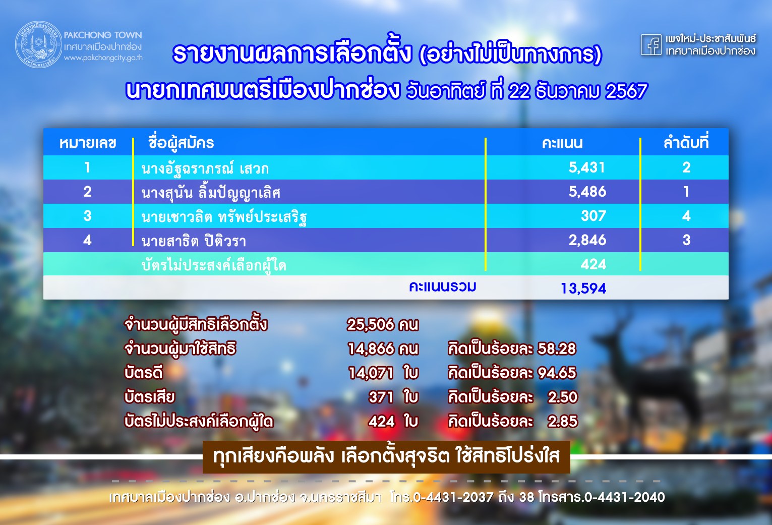 22 ธันวาคม 2567 คณะกรรมการการเลือกตั้ง เทศบาลเมืองปากช่อง จัดให้มีการเลือกตั้งนายกเทศมนตรี เมืองปากช่อง อ.ปากช่อง จ.นครราชสีมา แทนการลาออกของ นายคมกฤษณ์ ลิ้มปัญญาเลิศ อดีตนายกเทศมนตรีเมืองปากช่อง ที่ได้ยื่นหนังสือลาออกจากตำแหน่ง ตั้งแต่วันที่ 28 กันยายน 2567 โดยมีผู้สมัคร 4 คน คือ หมายเลข 1 นางอัจฉราภรณ์ เสวก , หมายเลข 2 นางสุนันท์ ลิ้มปัญญาเลิศ, หมายเลข 3 นายชวลิต ทรัพย์ประเสริฐ และ หมายเลข 4 ดร.สาธิต ปิติวรา ล่าสุด คณะกรรมการการเลือกตั้ง เทศบาลเมืองปากช่อง ประกาศผลการเลือกตั้ง นายกเทศมนตรีเมืองปากช่อง (อย่างไม่เป็นทางการ)