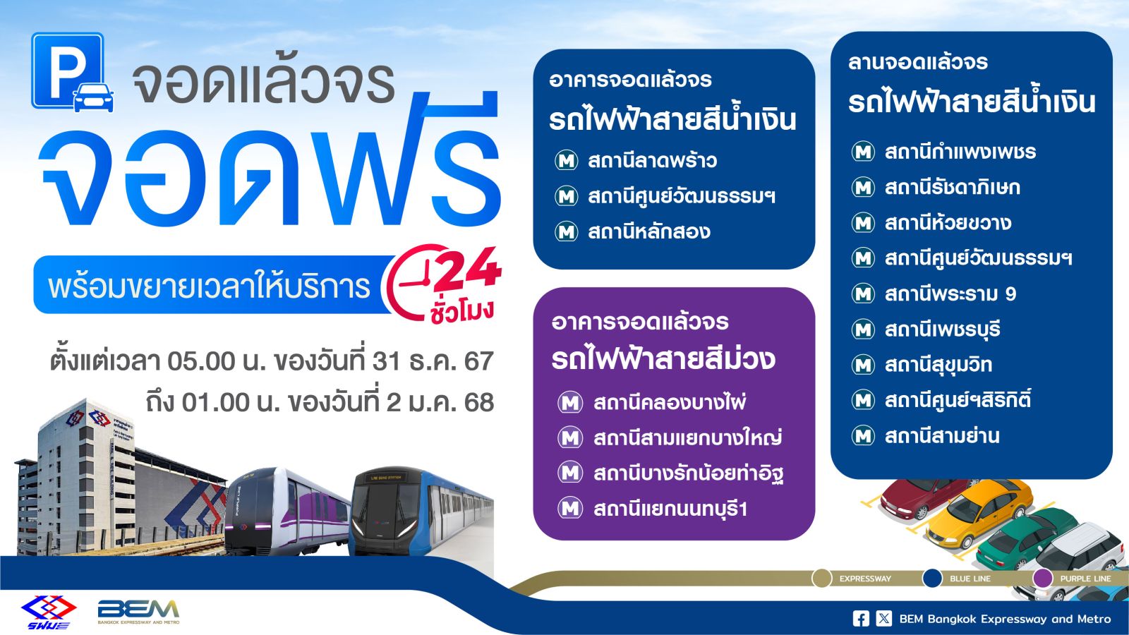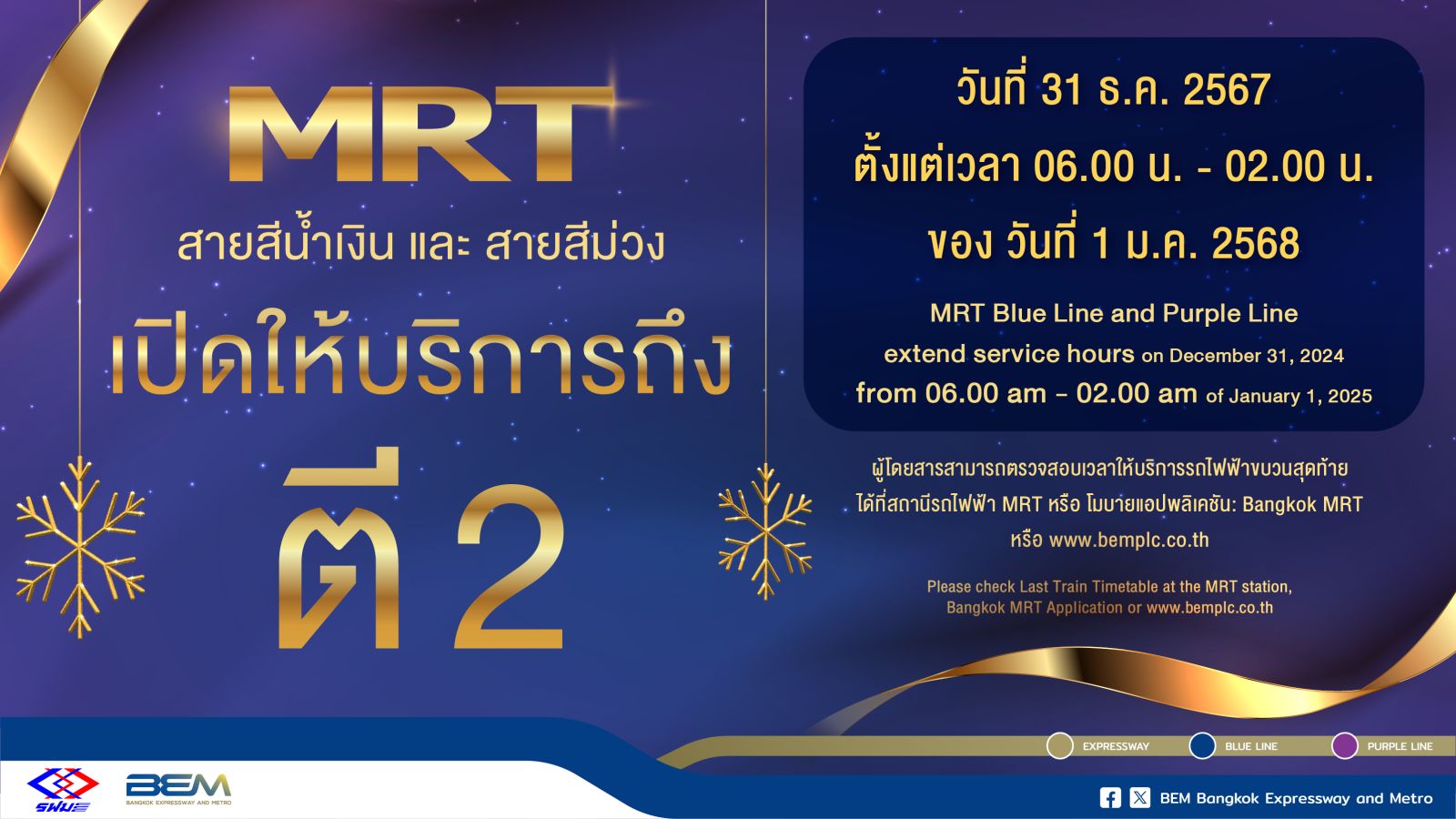 การรถไฟฟ้าขนส่งมวลชนแห่งประเทศไทย (รฟม.) และบริษัท ทางด่วนและรถไฟฟ้ากรุงเทพ จำกัด (มหาชน) หรือ BEM ร่วมส่งท้ายปีเก่า ต้อนรับปีใหม่ 2568 ด้วยการขยายเวลาการเปิดให้บริการรถไฟฟ้า MRT ทั้งสายเฉลิมรัชมงคล (สายสีน้ำเงิน) และสายฉลองรัชธรรม (สายสีม่วง) เปิดให้บริการข้ามปี วันที่ 31 ธันวาคม 2567 ตั้งแต่เวลา 06.00 น.- 02.00 น. ของวันที่ 1 มกราคม 2568 เพื่ออำนวยความสะดวกให้แก่ผู้โดยสารที่เดินทางท่องเที่ยวในช่วงเทศกาลปีใหม่ และส่งเสริมให้ประชาชนเดินทางด้วยระบบขนส่งสาธารณะ พร้อมกันนี้ ทาง รฟม. ยังได้ยกเว้นค่าบริการที่จอดรถ และขยายเวลาให้บริการอาคารและลานจอดแล้วจร ตั้งแต่เวลา 05.00 น. ของวันที่ 31 ธันวาคม 2567 ถึงเวลา 01.00 น. ของวันที่ 2 มกราคม 2568 โดยมีรายละเอียดดังนี้