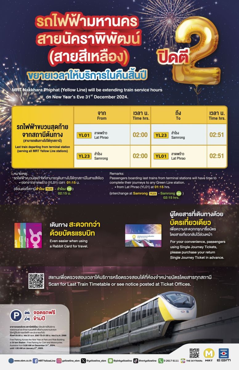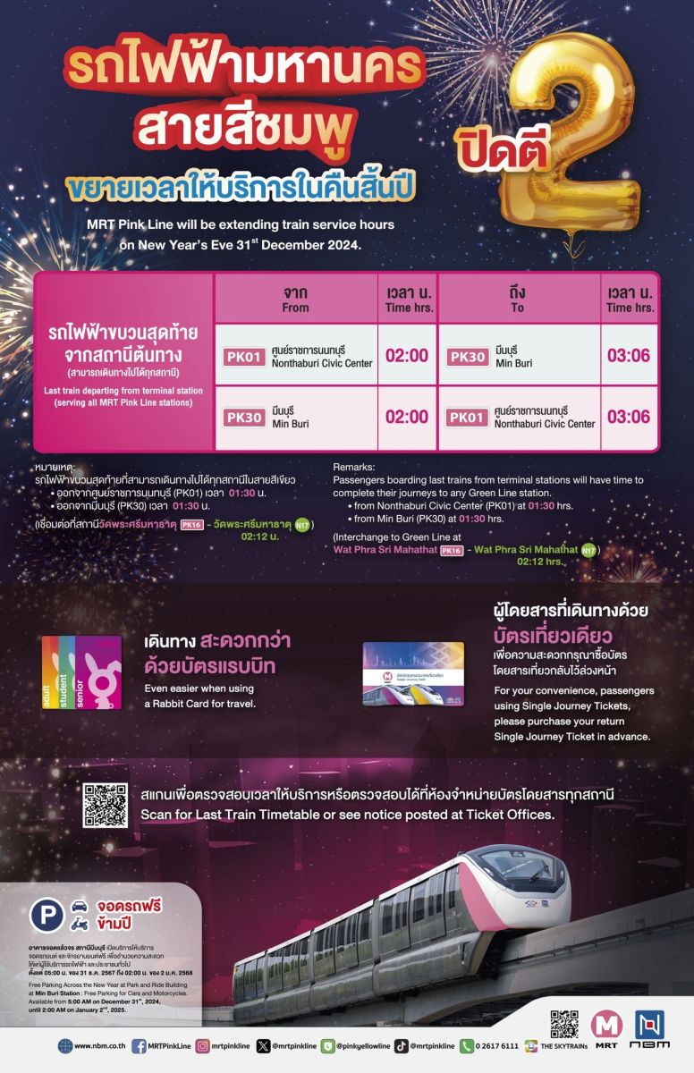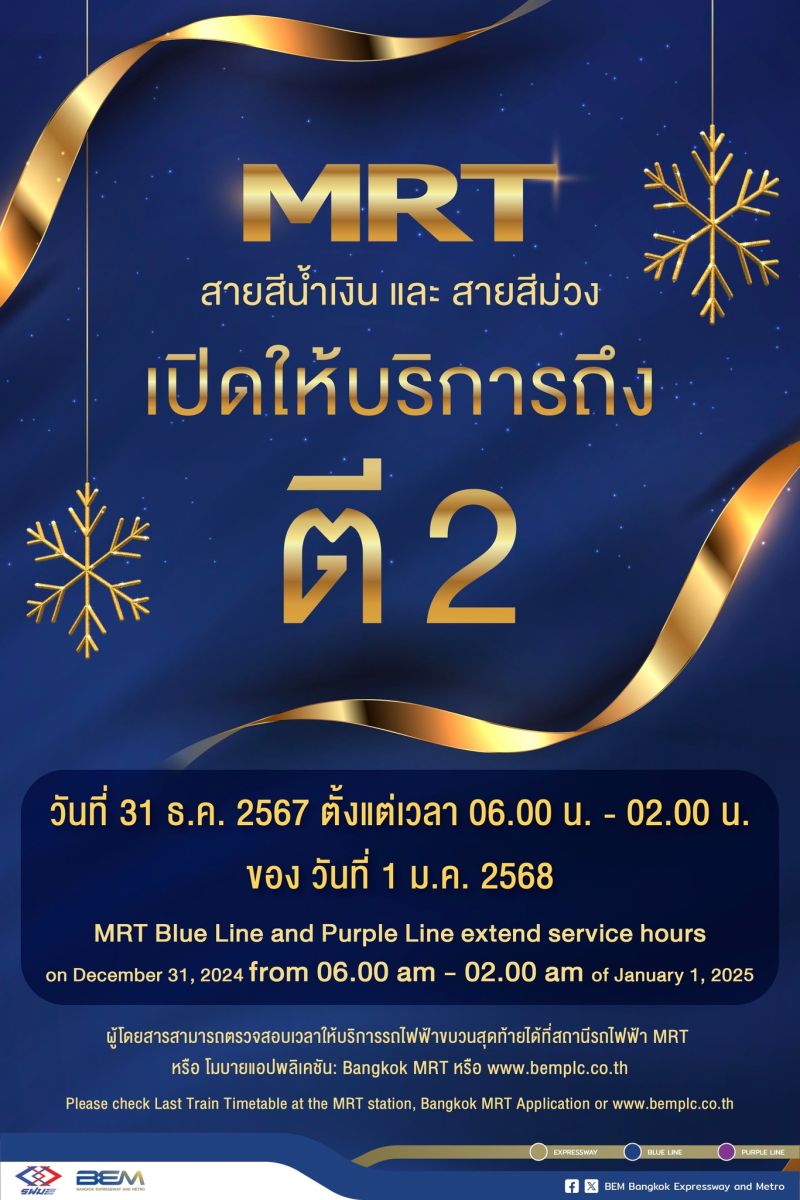 ในการนี้ กระทรวงคมนาคม และ รฟม. พร้อมด้วยผู้รับสัมปทานเดินรถไฟฟ้ามหานครทั้ง 4 สาย ได้แก่ บริษัท ทางด่วนและรถไฟฟ้ากรุงเทพ จำกัด (มหาชน) (BEM) ผู้ให้บริการเดินรถไฟฟ้ามหานคร สายเฉลิมรัชมงคล (MRT สายสีน้ำเงิน) และรถไฟฟ้ามหานคร สายฉลองรัชธรรม (MRT สายสีม่วง) บริษัทอีสเทิร์น บางกอกโมโนเรล จำกัด (EBM) ผู้ให้บริการเดินรถไฟฟ้ามหานคร สายนัคราพิพัฒน์ (MRT สายสีเหลือง) และ บริษัท นอร์ทเทิร์น บางกอกโมโนเรล จำกัด (NBM) ผู้ให้บริการเดินรถไฟฟ้ามหานคร สายสีชมพู (MRT สายสีชมพู) มีความตั้งใจจะส่งมอบขวัญในเทศกาลปีใหม่ 2568 โดยขยายเวลาสิ้นสุดการให้บริการรถไฟฟ้า MRT สายสีม่วง สายสีน้ำเงิน สายสีเหลือง และสายสีชมพู ในวันที่ 31 ธันวาคม 2567 เวลา 06:00 น. ถึงวันที่ 1 มกราคม 2568 เวลา 02:00 น. โดยรถไฟฟ้าเที่ยวสุดท้ายจะออกจากสถานีต้นทาง/ปลายทาง ในเวลา 02.00 น.
