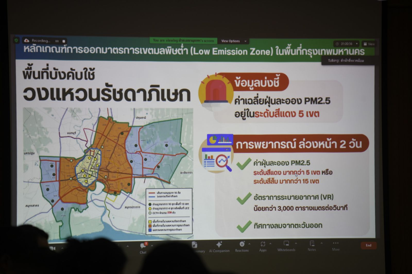 จากนั้น ที่ประชุมได้แจ้งเพื่อทราบถึงมาตรการเขตมลพิษต่ำ (Low Emission Zone) ในพื้นที่กรุงเทพมหานคร ว่า ผู้ว่าราชการกรุงเทพมหานครจะใช้อำนาจตามมาตรา 29 ประกอบกับมาตรา 37 วรรคสอง แห่ง พ.ร.บ. ป้องกันและบรรเทาสาธารณภัย พ.ศ. 2550 เมื่อ “เกิดหรือใกล้จะเกิดสาธารณภัย” ขึ้นในพื้นที่ใดและการอยู่อาศัยหรือดำเนินกิจการใด ๆ ในพื้นที่นั้นจะเป็นอันตรายอย่างร้ายแรงต่อสุขภาพประชาชน ในการออกประกาศกรุงเทพมหานคร เรื่อง การห้ามรถตั้งแต่ 6 ล้อขึ้นไปเข้าพื้นที่วงแหวนรัชดาภิเษกภายใต้หลักเกณฑ์และเงื่อนไขที่กำหนด โดยประกาศดังกล่าวให้กำหนดระยะเวลาการห้ามและเขตพื้นที่ที่ห้ามตามที่จำเป็นไว้ โดยมีเป้าหมายเป็นรถตั้งแต่ 6 ล้อขึ้นไป จำนวน 106,578 คัน (ยกเว้น EV, NGV, EURO 5 และ 6) และมีวัตถุประสงค์ในการห้ามรถตั้งแต่ 6 ล้อขึ้นไปเข้ากรุงเทพฯ ชั้นในในช่วงที่ฝุ่นอยู่ในช่วงอันตราย เพื่อลดปัจจัยต้นตอสำคัญของมลพิษและลดความอันตรายต่อสุขภาพประชาชนในพื้นที่