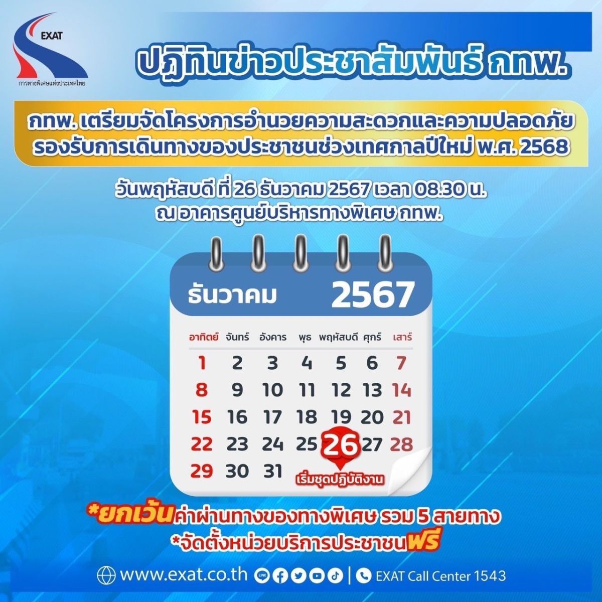 การทางพิเศษแห่งประเทศไทย (กทพ.) เตรียมจัดโครงการอำนวยความสะดวกและความปลอดภัย รองรับการเดินทางของประชาชนช่วงเทศกาลปีใหม่ พ.ศ. 2568 และปล่อยแถวชุดปฏิบัติงานบนทางพิเศษ ในวันพฤหัสบดีที่ 26 ธันวาคม 2567 เวลา 08.30 น. ณ อาคารศูนย์บริหารทางพิเศษ กทพ. โดย กทพ. จะยกเว้นค่าผ่านทางของทางพิเศษ รวม 5 สายทาง พร้อมทั้งจัดตั้งหน่วยบริการประชาชนฟรี เพื่อให้บริการและอำนวยความสะดวกแก่ประชาชนที่ใช้ทางพิเศษเดินทางเข้า - ออก กรุงเทพมหานคร