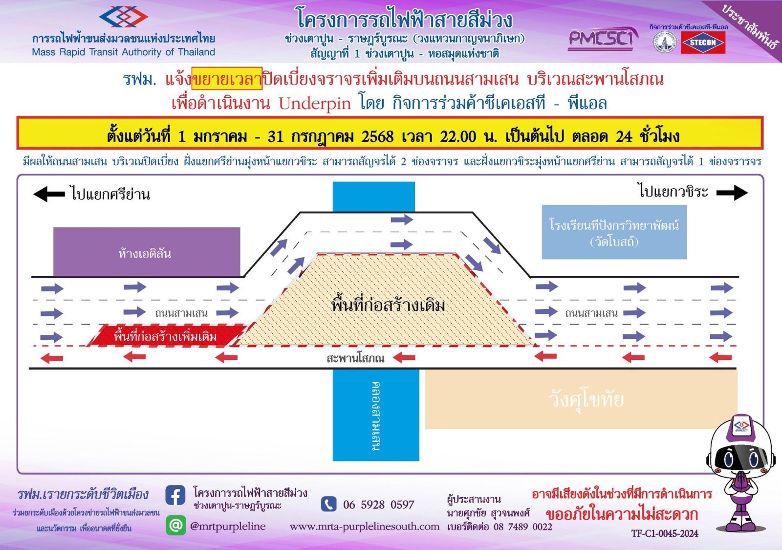 การรถไฟฟ้าขนส่งมวลชนแห่งประเทศไทย (รฟม.) แจ้งว่า กิจการร่วมค้า ซีเคเอสที-พีแอล ผู้รับจ้างออกแบบและก่อสร้างอุโมงค์ทางวิ่งและสถานีใต้ดิน โครงการรถไฟฟ้าสายสีม่วง ช่วงเตาปูน - ราษฎร์บูรณะ (วงแหวนกาญจนาภิเษก) สัญญาที่ 1 ช่วงเตาปูน - หอสมุดแห่งชาติ มีความจำเป็นต้องขยายเวลาปิดเบี่ยงจราจรเพิ่มเติมบนถนนสามเสน บริเวณสะพานโสภณ เพื่อดำเนินงาน Underpin ตั้งแต่วันที่ 1 มกราคม – 31 กรกฎาคม 2568 เวลา 22.00 น. เป็นต้นไป ตลอด 24 ชั่วโมง มีผลให้ถนนสามเสน บริเวณปิดเบี่ยง ฝั่งแยกศรีย่านมุ่งหน้าแยกวชิระ สามารถสัญจรได้ 2 ช่องจราจร และฝั่งแยกวชิระมุ่งหน้าแยกศรีย่าน สามารถสัญจรได้ 1 ช่องจราจร