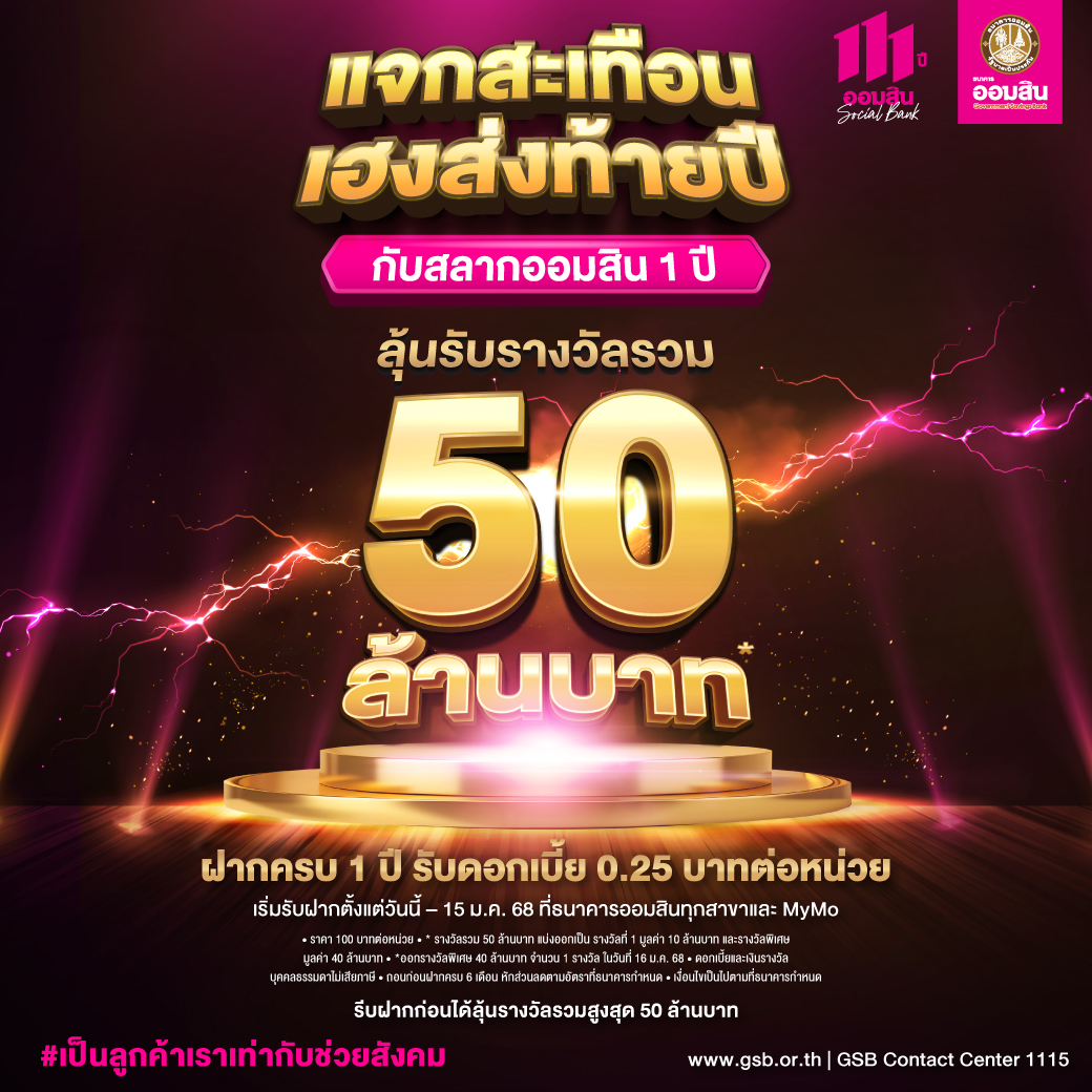 ลุ้นเฮงส่งท้ายปลายปี โชคดีมีเงินล้าน กับสลากออมสิน 1 ปี (ใบสลากและดิจิทัล) ลุ้นรางวัลมูลค่ารวม 50 ล้านบาท