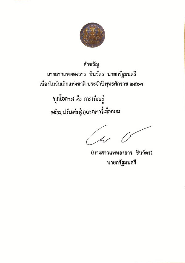 นายกฯ มอบคำขวัญเนื่องในวันเด็กแห่งชาติ ผ่านเฟสบุ๊ก ระบุว่า