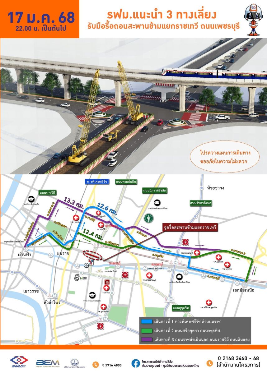 รฟม. แจ้ง 17 มกราคมนี้ ! เริ่มปิดเบี่ยงจราจร รื้อถอนสะพานข้ามแยกราชเทวี พร้อมแนะ 3 ทางเลือก หลีกเลี่ยงพื้นที่ก่อสร้างโครงการรถไฟฟ้าสายสีส้มฯ