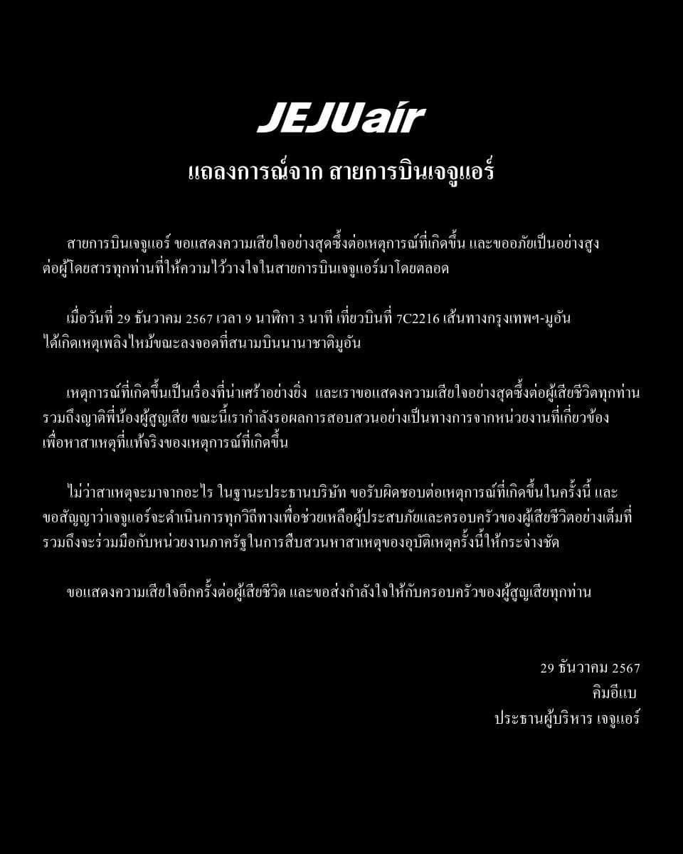 สายการบินเจจูแอร์ ขอแสดงความเสียใจอย่างสุดซึ้งต่อเหตุการณ์ที่เกิดขึ้น และขออภัยเป็นอย่างสูงต่อผู้โดยสารทุกท่านที่ให้ความไว้วางใจในสายการบินเจจูแอร์มาโดยตลอด