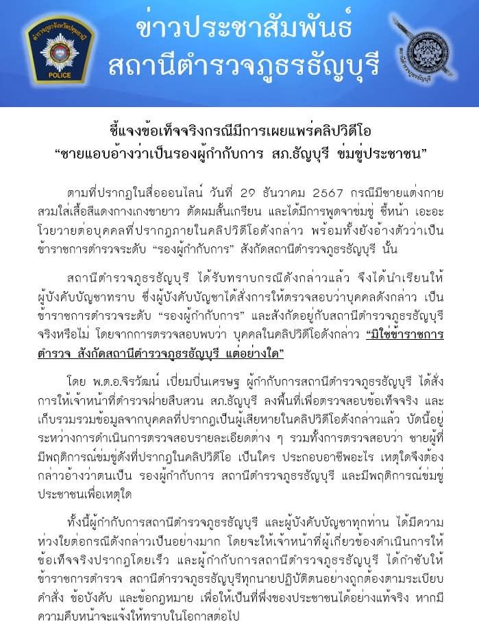 ตามที่ปรากฏในสื่อออนไลน์ วันที่ 29 ธันวาคม 2567 กรณีมีชายแต่งกาย สวมใส่เสื้อสีแดงกางเกงขายาว ตัดผมสั้นเกรียน และได้มีการพูดจาข่มขู่ ชี้หน้า เอะอะโวยวายต่อบุคคลที่ปรากฎภายในคลิปวิดีโอดังกล่าว พร้อมทั้งยังอ้างตัวว่าเป็นข้าราชการตำรวจระดับ “รองผู้กำกับการ” สังกัดสถานีตำรวจภูธรธัญบุรี นั้น