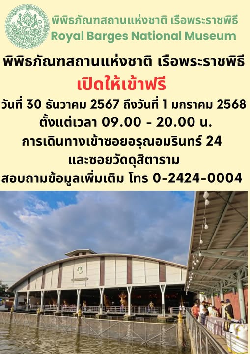 พิพิธภัณฑสถานแห่งชาติ เรือพระราชพิธี เปิดให้เข้าชมฟรี วันที่ 30 ธันวาคม 2567 ถึง วันที่ 1 มกราคม 2568 ตั้งแต่เวลา 09.00 น - 20.00 น.