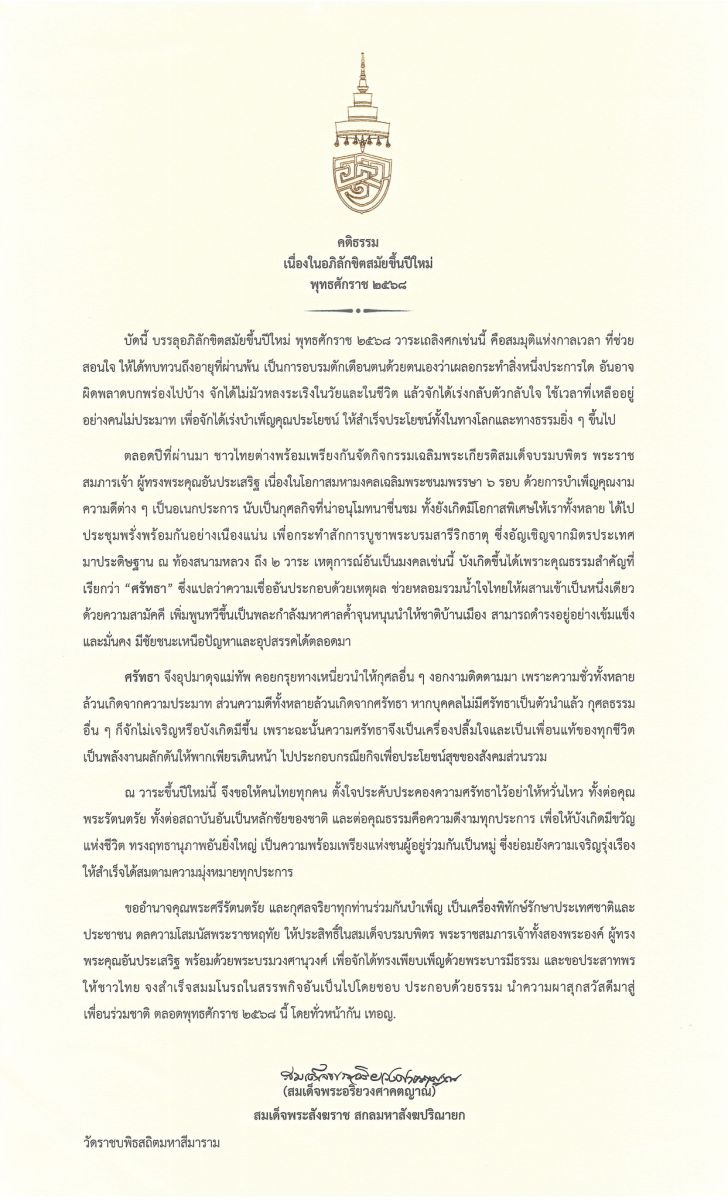 “บัดนี้ บรรลุอภิลักขิตสมัยขึ้นปีใหม่ พุทธศักราช ๒๕๖๘ วาระเถลิงศกเช่นนี้ คือสมมุติแห่งกาลเวลา ที่ช่วยสอนใจ ให้ได้ทบทวนถึงอายุที่ผ่านพ้น เป็นการอบรมตักเตือนตนด้วยตนเองว่าเผลอกระทำสิ่งหนึ่งประการใด อันอาจผิดพลาดบกพร่องไปบ้าง จักได้ไม่มัวหลงระเริงในวัยและในชีวิต แล้วจักได้เร่งกลับตัวกลับใจ ใช้เวลาที่เหลืออยู่อย่างคนไม่ประมาท เพื่อจักได้เร่งบำเพ็ญคุณประโยชน์ ให้สำเร็จประโยชน์ทั้งในทางโลกและทางธรรมยิ่ง ๆ ขึ้นไป