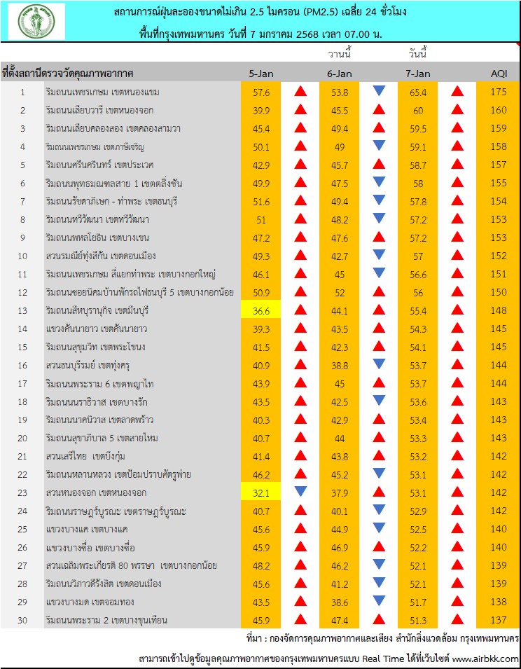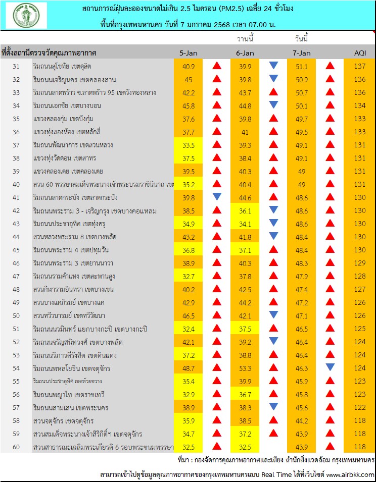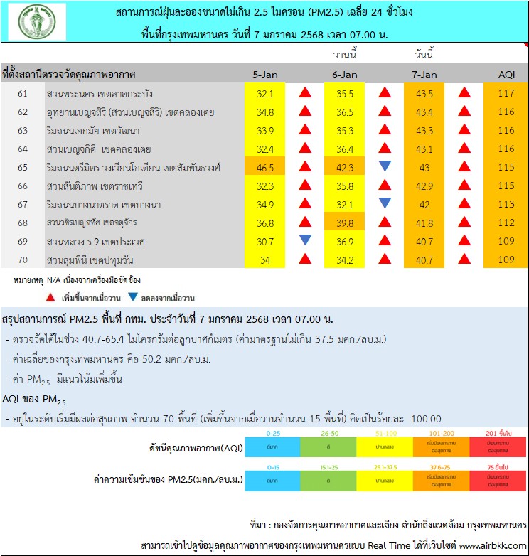ศูนย์ข้อมูลคุณภาพอากาศกรุงเทพมหานครขอรายงานสถานการณ์ฝุ่นละออง PM 2.5 ของสถานีตรวจวัดคุณภาพอากาศของกรุงเทพมหานคร ประจำวันอังคารที่ 7 มกราคม พ.ศ. 2568 เวลา 07.00 น. ค่าเฉลี่ย 24 ชั่วโมง ของฝุ่นละอองขนาดไม่เกิน 2.5 ไมครอน (PM2.5) ตรวจวัดได้ 40.7-65.4 ไมโครกรัม/ลูกบาศก์เมตร (มคก./ลบ.ม.) พบว่าเกินมาตรฐานอยู่ในระดับสีส้ม เริ่มมีผลกระทบต่อสุขภาพ (มาตรฐานไม่เกิน 37.5 มคก./ลบ.ม.) จำนวน 70 พื้นที่ คือ