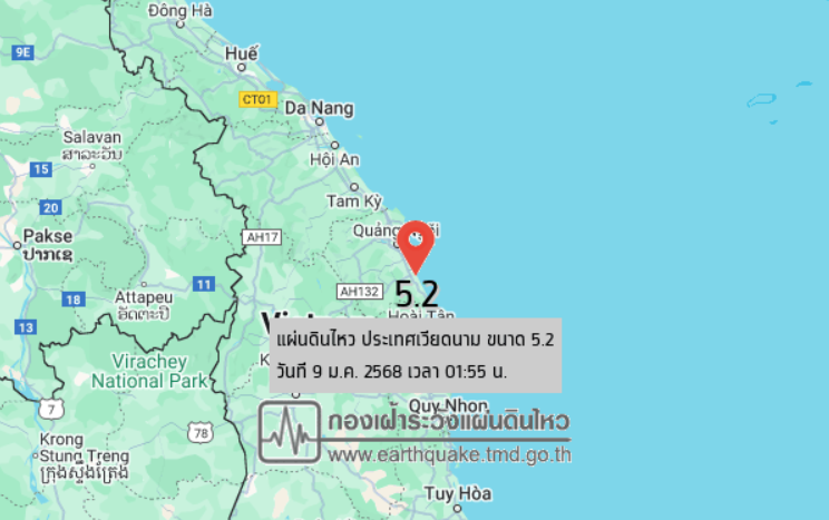 แผ่นดินไหวขนาด 5.2 ภายในพื้นที่ประเทศเวียดนาม ศูนย์กลางห่างจาก จ.อุบลราชธานี ประมาณ 442 กม.