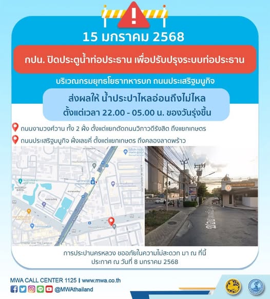 การประปานครหลวง (กปน.) มีความจำเป็นต้องปิดประตูน้ำท่อประธานขนาดเส้นผ่านศูนย์กลาง 1,000 มิลลิเมตร เพื่อปรับปรุงระบบท่อประธาน บริเวณกรมยุทธโยธาทหารบก ถนนประเสริฐมนูกิจ ในคืนวันพุธที่ 15 มกราคม 2568 ตั้งแต่เวลา 22.00 - 05.00 น. ของวันรุ่งขึ้น เพื่อให้ประชาชนได้รับบริการน้ำประปาอย่างเพียงพอและทั่วถึง โดยระหว่างดำเนินการ ส่งผลให้ น้ำประปาไหลอ่อนถึงไม่ไหล ในพื้นที่ดังต่อไปนี้