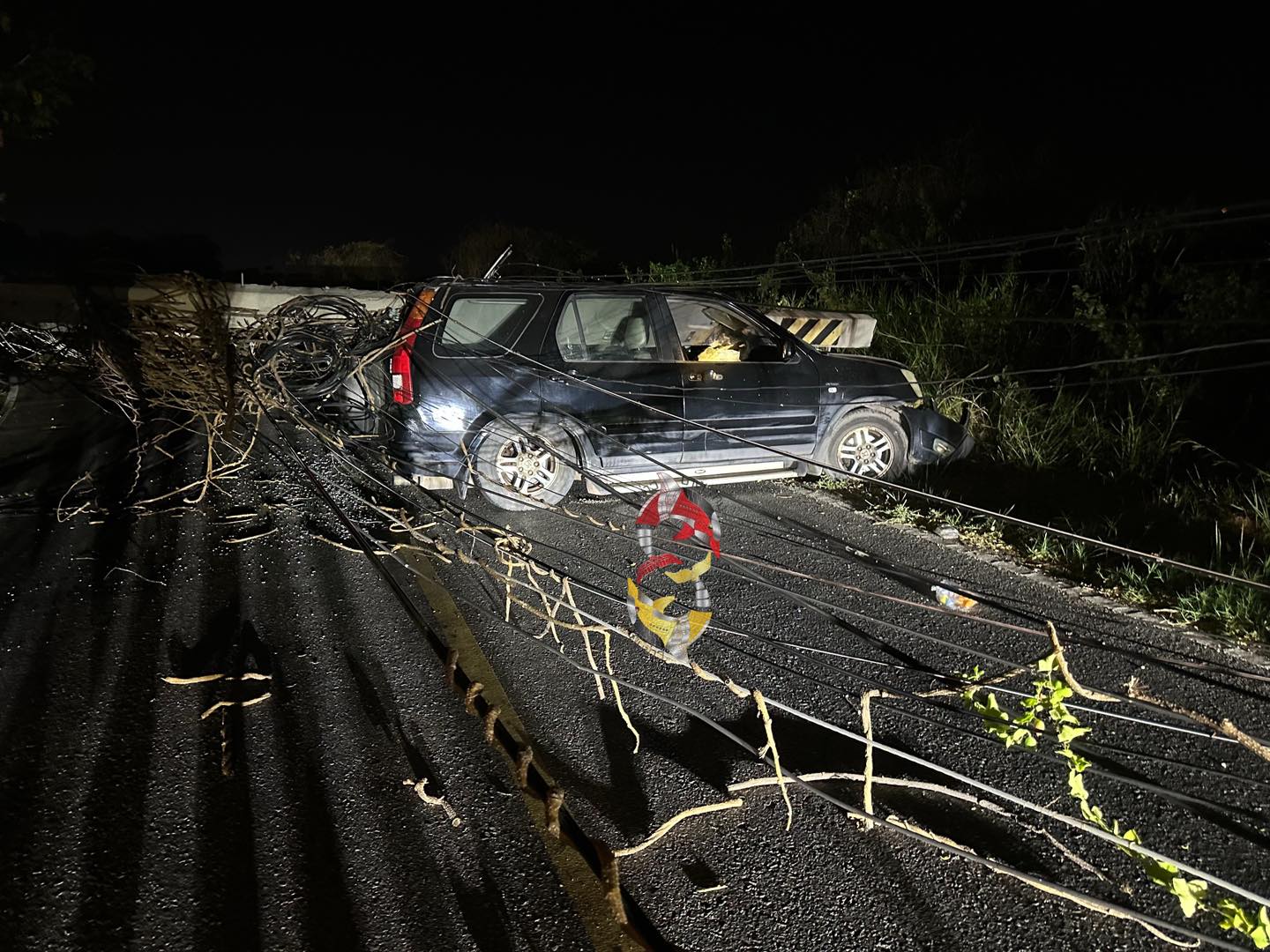 ในที่เกิดเหตุพบเสาไฟฟ้าถูกรถนั่งส่วนบุคคบ ฮอนด้าซีอาร์วี จอดชนติดอยู่กับเสาไฟฟ้า โดยเสาไฟฟ้าได้ล้มทับหลังคารถได้รับความเสียหาย แต่ไม่พบคนขับภายในรถ จากนั้นได้ทำการตรวจสอบพื้นที่โดยรอบบริเวณที่เกิดเหตุ พบว่ายังมีเสาไฟฟ้าที่ล้มลงมา อีก จำนวน 2 ต้น รวมทั้งสิ้น 3 ต้น ทำให้ไฟฟ้าบริเวณนั้นดับเป็นวงกว้าง จึงได้รีบทำการแจ้งเจ้าหน้าที่การไฟฟ้าเข้าซ่อมแซมโดยด่วน