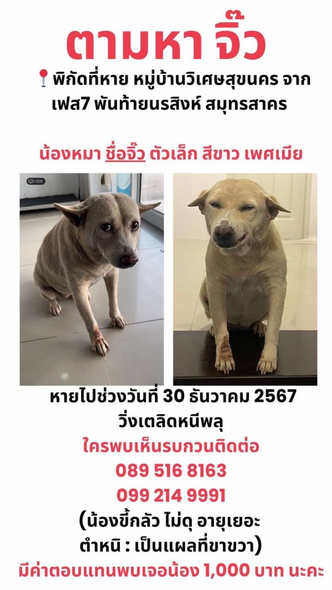 ตามหา 'น้องจิ๊ว' สุนัขพันธุ์ไทย สีขาว เพศเมีย น้องตกใจเสียงพลุ วิ่งเตลิดหนีออกจากบ้าน หมู่บ้านวิเศษสุขนคร จากเฟส7 พันท้ายนรสิงห์ สมุทรสาคร ช่วงหัวค่ำ วันที่ 31 ธ.ค. 67 เนื่องจากในหมู่บ้านจุดพลุกัน