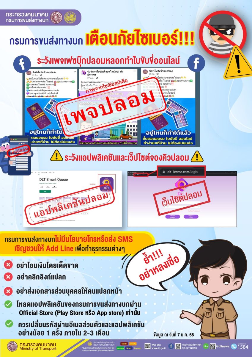 ขนส่งฯ เตือนภัยไซเบอร์!! อย่าหลงเชื่อเพจปลอม หลอกทำใบขับขี่ออนไลน์-แอปฯและเว็บไซต์ จองคิวปลอม ย้ำ!!! อย่าโอนเงินโดยเด็ดขาด แนะดำเนินการผ่านช่องทางของกรมการขนส่งทางบกเท่านั้น