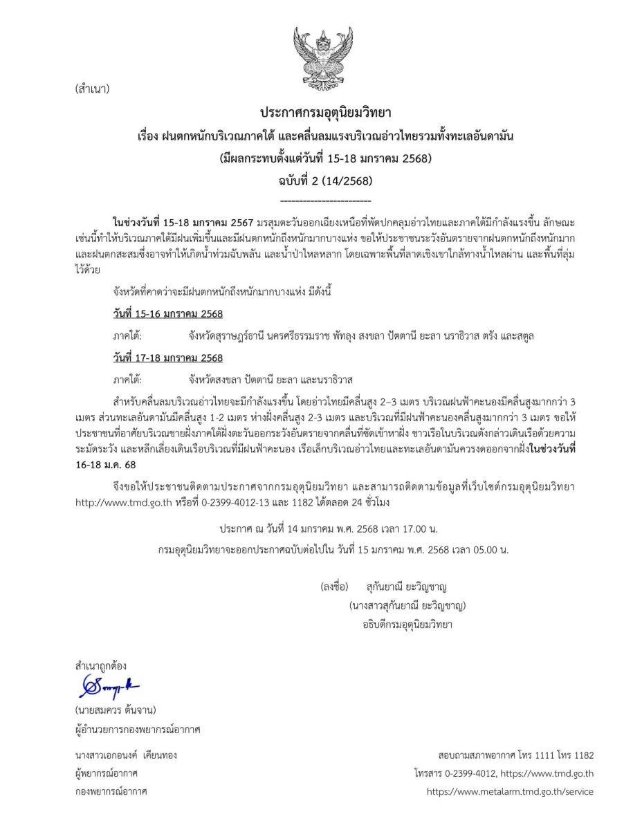 ประกาศกรมอุตุนิยมวิทยา เรื่อง ฝนตกหนักบริเวณภาคใต้ และคลื่นลมแรงบริเวณอ่าวไทยรวมทั้งทะเลอันดามัน (มีผลกระทบตั้งแต่วันที่ 15-18 มกราคม 2568) ฉบับที่ 2 (14/2568)