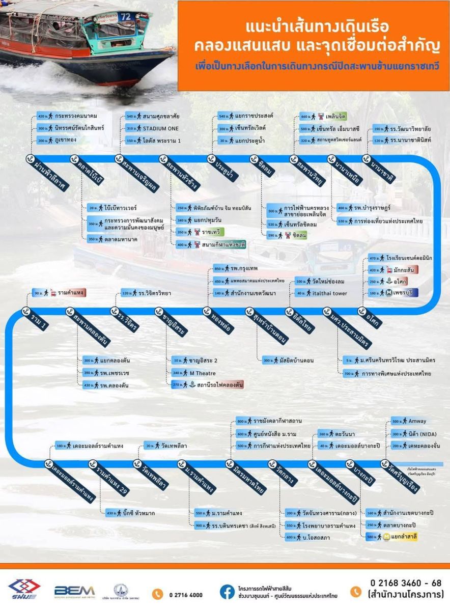 ดังนั้น เพื่อเป็นการลดผลกระทบด้านการจราจรในระหว่างการปิดสะพานข้ามแยกราชเทวี จึงขอประชาสัมพันธ์เส้นทางเดินเรือคลองแสนแสบ เพื่อเป็นทางเลือกในการเดินทาง โดยรวบรวมจุดเชื่อมต่อสำคัญ เพื่อวางแผนการเดินทางไปยังจุดหมายปลายทางได้สะดวกมากยิ่งขึ้น