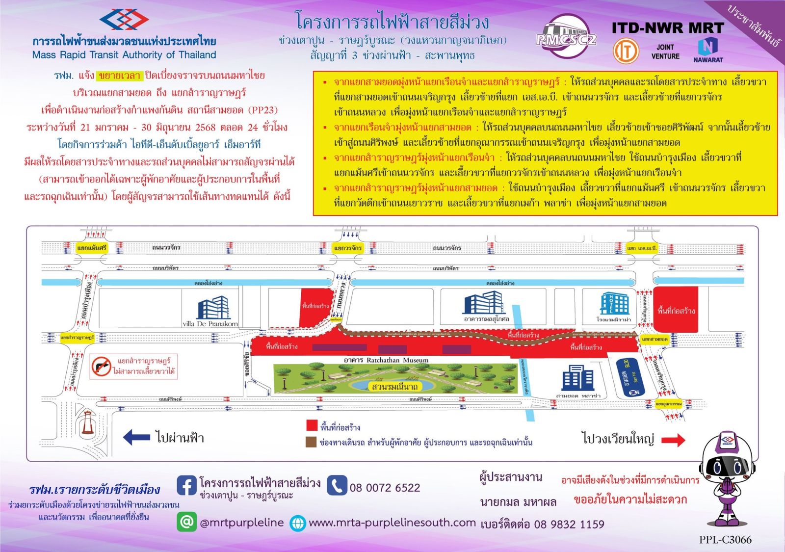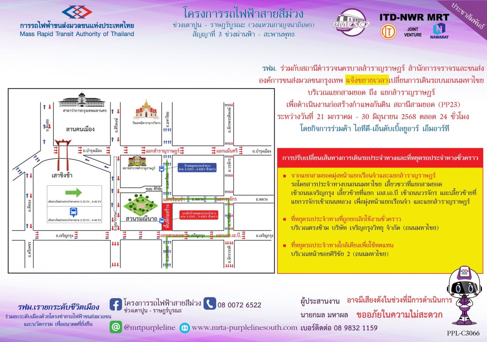 การรถไฟฟ้าขนส่งมวลชนแห่งประเทศไทย (รฟม.) แจ้งว่า กิจการร่วมค้า ไอทีดี-เอ็นดับเบิ้ลยูอาร์ เอ็มอาร์ที ผู้รับจ้างงานออกแบบและก่อสร้างอุโมงค์ทางวิ่งและสถานีใต้ดิน โครงการรถไฟฟ้าสายสีม่วง ช่วงเตาปูน - ราษฎร์บูรณะ (วงแหวนกาญจนาภิเษก) สัญญาที่ 3 ช่วงผ่านฟ้า – สะพานพุทธ มีความจำเป็นต้องขยายเวลาเปลี่ยนการเดินรถ บนถนนมหาไชย บริเวณแยกสามยอด ถึง แยกสำราญราษฎร์ เพื่อดำเนินงานก่อสร้างกำแพงกันดิน สถานีสามยอด (PP23) ระหว่างวันที่ 21 มกราคม – 30 มิถุนายน 2568 ตลอด 24 ชั่วโมง มีผลให้รถโดยสารประจำทางและรถส่วนบุคคลไม่สามารถสัญจรผ่านได้ (สามารถเข้าออกได้เฉพาะผู้พักอาศัยและผู้ประกอบการในพื้นที่และรถฉุกเฉินเท่านั้น) โดยผู้สัญจรสามารถใช้เส้นทางทดแทนได้ ดังนี้
