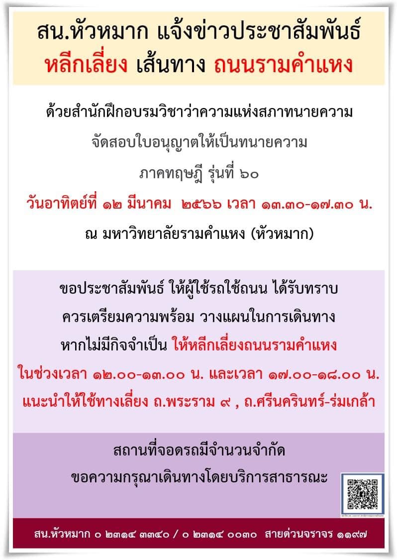 วันอาทิตย์ที่ 12 มีนาคม 2566 เวลา 12.30 น. สภาพการจราจร บริเวณ ถนนรามคำแหง หน้า ม.รามคำแหง (หัวหมาก) การจราจรเคลื่อนตัวได้ช้า เนื่องจาก วันนี้ เวลา 13.30 -17.30 น. สำนักฝึกอบรมวิชาว่าความแห่งสภาทนายความ จัดสอบใบอนุญาตให้เป็นทนายความภาคทฤษฎี รุ่นที่ 60 ณ มหาวิทยาลัยรามคำแหง (หัวหมาก) โดยมีผู้เข้าสอบจำนวน 9,000 ประชาสัมพันธ์ ให้ผู้รถใช้ถนน หลีกเลี่ยงถนนรามคำแหง ในช่วงเวลา 12.00 -13.00 น. และเวลา 17.00-18.00 น.