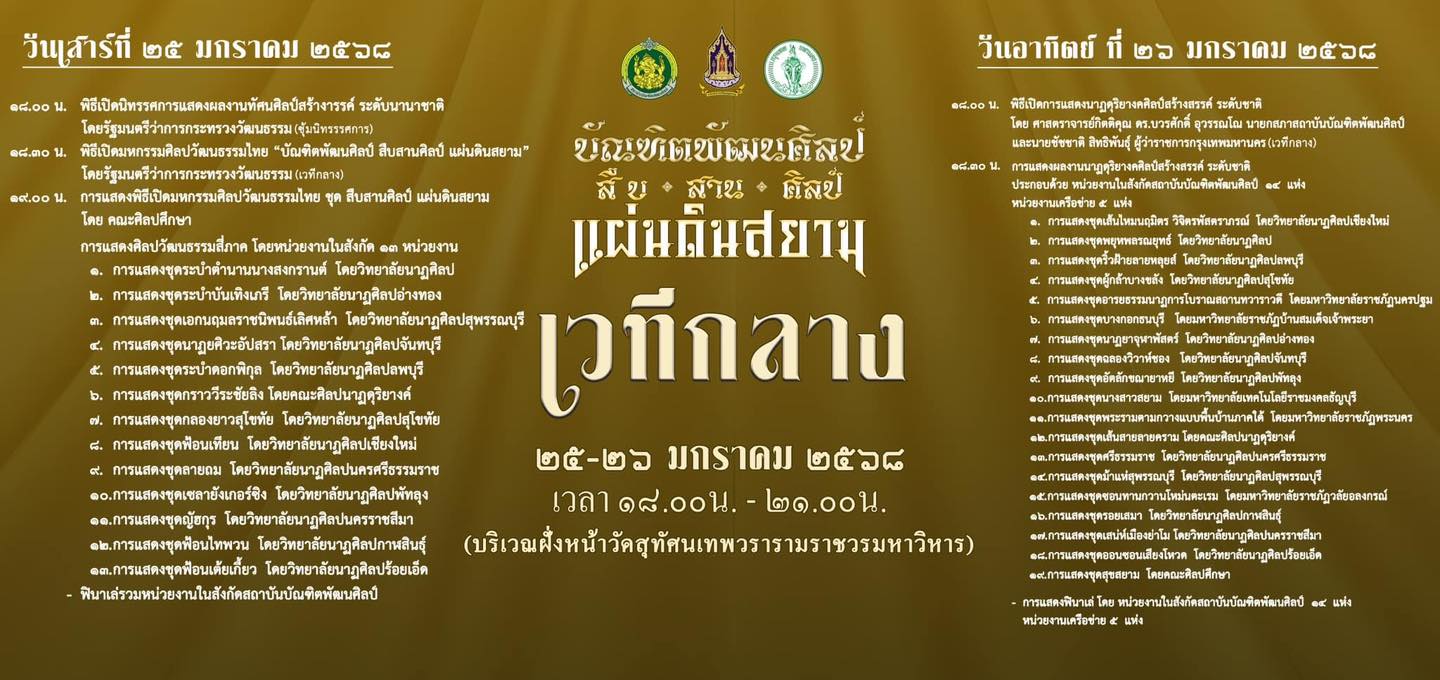 สำหรับงานมหกรรมศิลปวัฒนธรรมไทย “บัณฑิตพัฒนศิลป์ สืบสานศิลป์ แผ่นดินสยาม” ในวันที่ 25 - 26 ม.ค. 68 ณ ลานคนเมือง เวลา 10.00 - 21.00 น. มีชุดการแสดง ดนตรีประกอบการแสดงและความหลากหลายทางวัฒนธรรมของทุกภูมิภาค การสร้างสรรค์งานด้านนาฏศิลป์ ดนตรี คีตศิลป์ ทัศนศิลป์ และช่างศิลป์ที่มีความงดงาม ตระการตา เปี่ยมไปด้วยเสน่ห์ความเป็นไทย สามารถสร้างความประทับใจให้แก่ผู้ชมได้ทุกกลุ่มและทุกวัฒนธรรม เพราะสะท้อนถึงรากเหง้าที่เป็นมรดกทางวัฒนธรรมของไทยที่ตกผลึกมาอย่างยาวนาน เป็นการเผยแพร่ Soft Power ของไทยโดยเฉพาะในเรื่องของนาฎศิลป์ ดนตรี และทัศนศิลป์ ช่วยสร้างภาพลักษณ์ที่ดีให้แก่ประเทศไทยไปสู่นานาชาติ และขับเคลื่อน Soft Power ต่อยอดทุนทางวัฒนธรรมในการสร้างมูลค่าเพิ่มทางเศรษฐกิจ ส่งเสริมเศรษฐกิจของชาติตามนโยบายของรัฐบาล