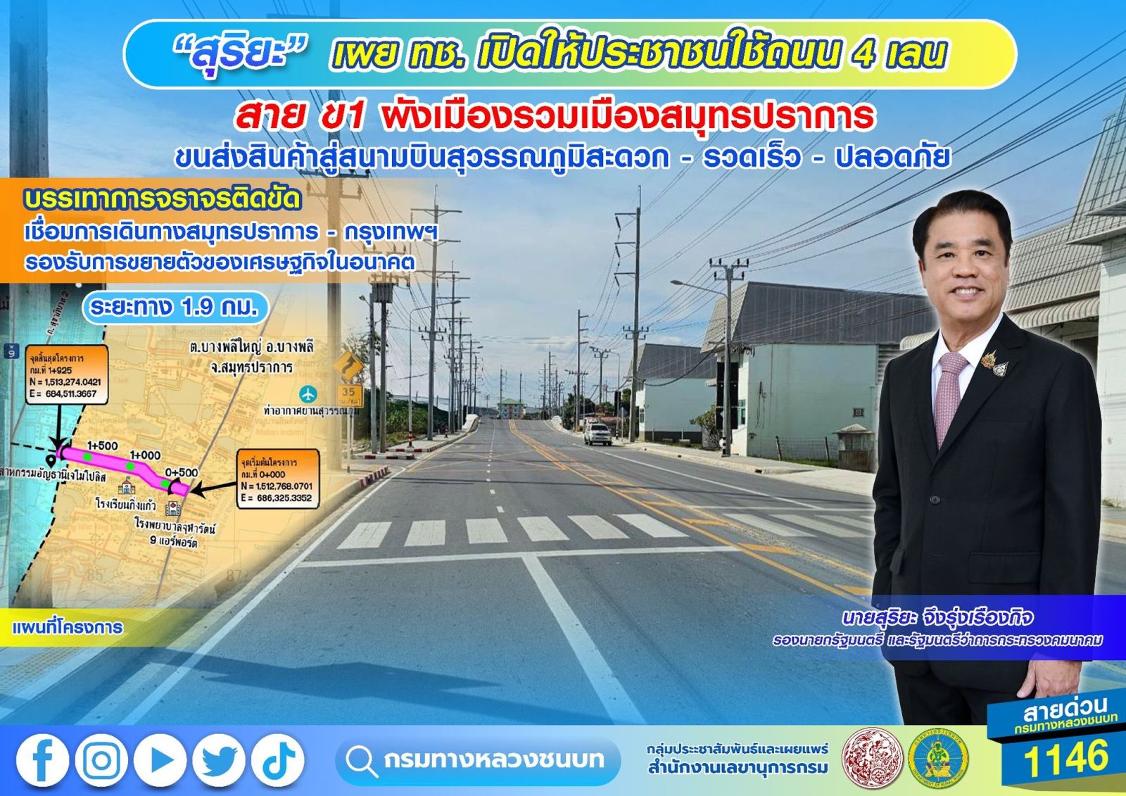 “สุริยะ” เผย ทช. เปิดให้ประชาชนใช้ถนน 4 เลน สาย ข1 ผังเมืองรวมเมืองสมุทรปราการ ระยะทาง 1.9 กม. ขนส่งสินค้าสู่สนามบินสุวรรณภูมิสะดวก - รวดเร็ว - ปลอดภัย บรรเทาการจราจรติดขัด เชื่อมการเดินทางสมุทรปราการ - กรุงเทพฯ รองรับการขยายตัวของเศรษฐกิจในอนาคต