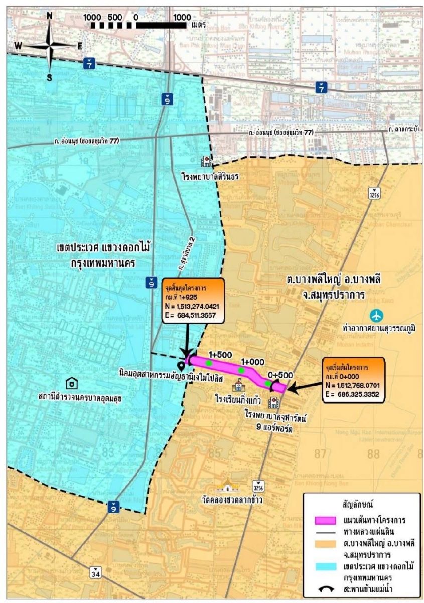 ด้านนายมนตรี เดชาสกุลสม อธิบดี ทช. กล่าวว่า โครงการก่อสร้างถนนสาย ข1 ผังเมืองรวมเมืองสมุทรปราการ จังหวัดสมุทรปราการ ใช้งบประมาณ 157.85 ล้านบาท มีจุดเริ่มต้นบริเวณ กม.ที่ 0+000 เชื่อมจาก ทล.3256 (ถนนกิ่งแก้ว) ประมาณ กม.ที่ 17+090 ด้านซ้ายไปทางทิศตะวันตกตามแนวถนนคอนกรีตเดิม (สป.4008 หรือ ซอยกิ่งแก้ว 25/1) ตัดผ่านคลองชวดลากข้าวและคลองสิงห์โต มีจุดสิ้นสุดโครงการบริเวณ กม.ที่ 1+925 บรรจบกับถนนของเขตประเวศ กรุงเทพมหานคร และเชื่อมต่อไปยังถนนวงแหวนรอบนอกตะวันออก รวมระยะทาง 1.925 กิโลเมตร