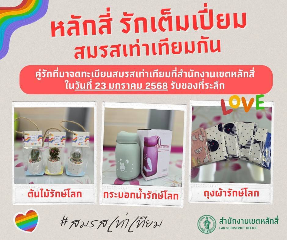 พิเศษ สำหรับวันนี้..คู่รักที่มาจดทะเบียนสมรสเท่าเทียม ณ สำนักงานเขตหลักสี่ รับของที่ระลึก ต้นไม้รักษ์โลก กระบอกน้ำรักษ์โลก ถุงผ้ารักษ์โลก