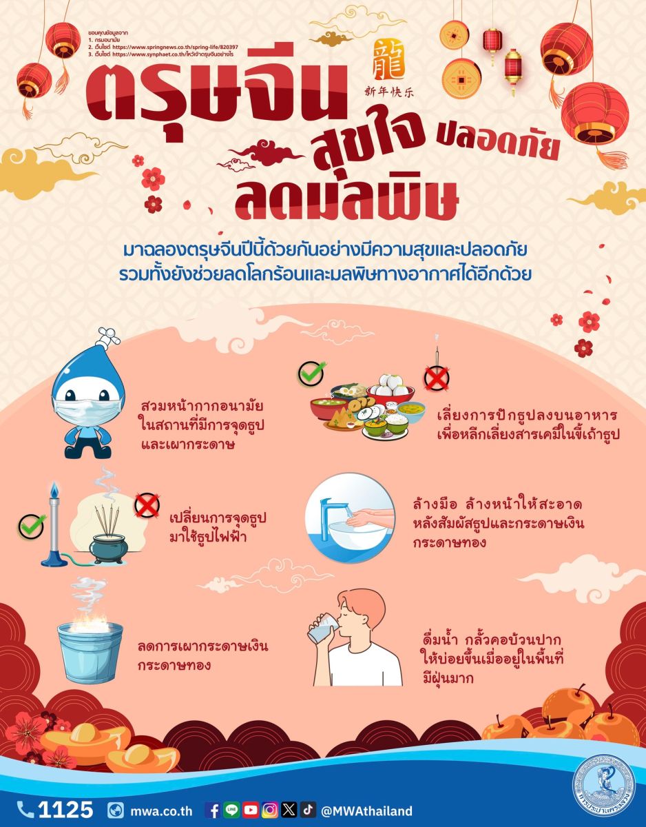 นายกิตติ กล่าวเพิ่มเติมว่า ด้วยความห่วงใยสุขภาพอนามัยของประชาชน จากภาวะโลกร้อน และปัญหาฝุ่นละอองขนาดเล็ก PM2.5 เกินค่ามาตรฐาน กปน. ขอเชิญชวนสวมหน้ากากอนามัยหากอยู่ในสถานที่มีฝุ่นควัน ลดการจุดธูปหรือเปลี่ยนมาใช้ธูปไฟฟ้า ลดการเผากระดาษเงินกระดาษทองเพื่อช่วยลดปริมาณฝุ่นละอองจากการเผาไหม้ พร้อมแนะวิธีดูแลสุขอนามัยที่ดี อาทิ เลี่ยงการปักธูปลงบนอาหาร หมั่นล้างมือ ล้างหน้าให้สะอาด และควรดื่มน้ำ กลั้วคอบ้วนปากให้บ่อยขึ้น ทั้งนี้ เพื่อความสุขใจและสุขอนามัยที่ดีตลอดช่วงเทศกาลตรุษจีน