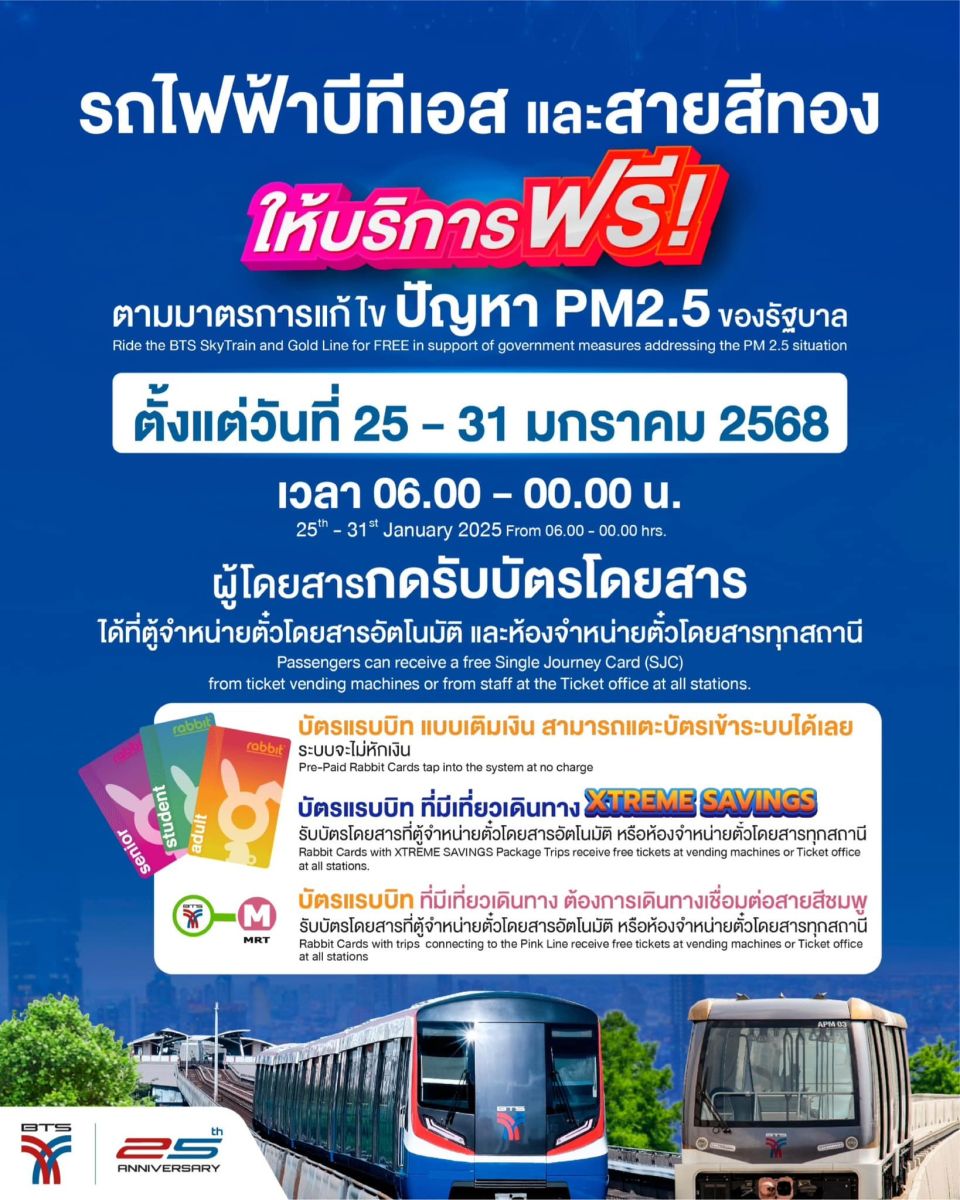** รถไฟฟ้าสายสีแดง ขานรับนโยบายรัฐบาล แก้ปัญหาฝุ่น PM 2.5 เปิดให้โดยสารรถไฟฟ้าฟรี 7 วัน 25 - 31 มกราคม 2568
