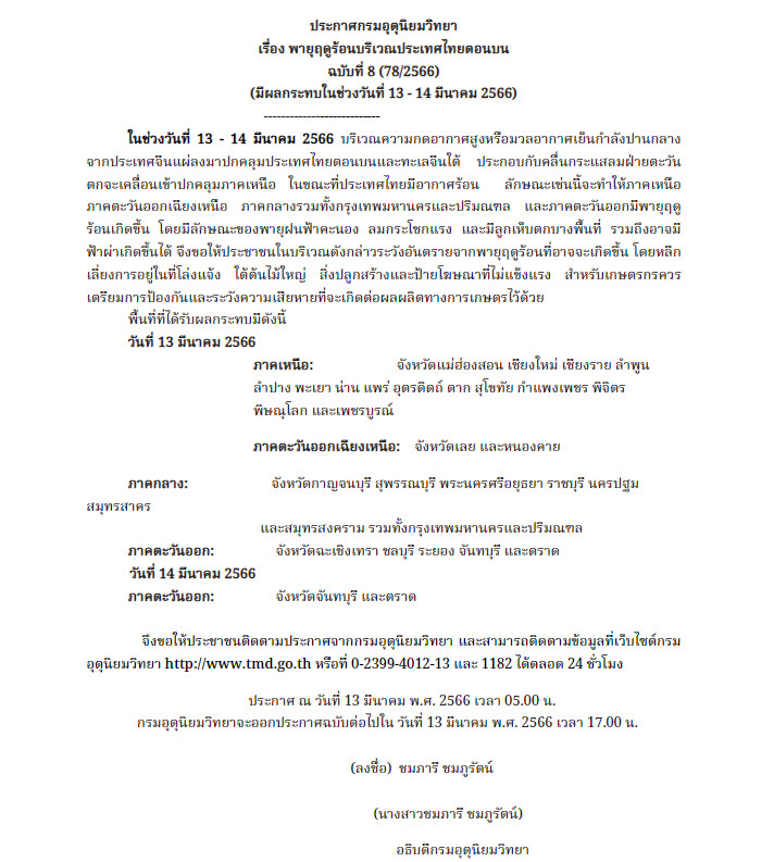 ประกาศกรมอุตุนิยมวิทยา เรื่อง พายุฤดูร้อนบริเวณประเทศไทยตอนบน ฉบับที่ 8 มีผลกระทบในช่วงวันที่ 13 - 14 มีนาคม 2566