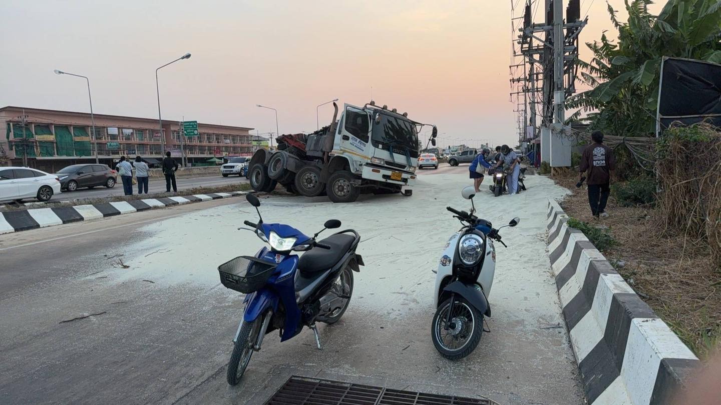 07.50 น. ถนนสุวินทวงศ์ ขาเข้า เชิงทางขึ้นสะพานข้ามทางรถไฟ ตรงข้ามวัดทดราษฎร์เจริญมณีฤทธิ์ อ.เมือง จ.ฉะเชิงเทรา อุบัติเหตุ รถบรรทุก เสียหลักพลิกตะแคง ทำให้สิ่งของที่บรรทุกมาคือปลายข้าว หล่นลงมาบรพื้นถนนจำนวนมาก ช่องทางคู่ขนานผ่านไม่ได้เลย รถติดมาก