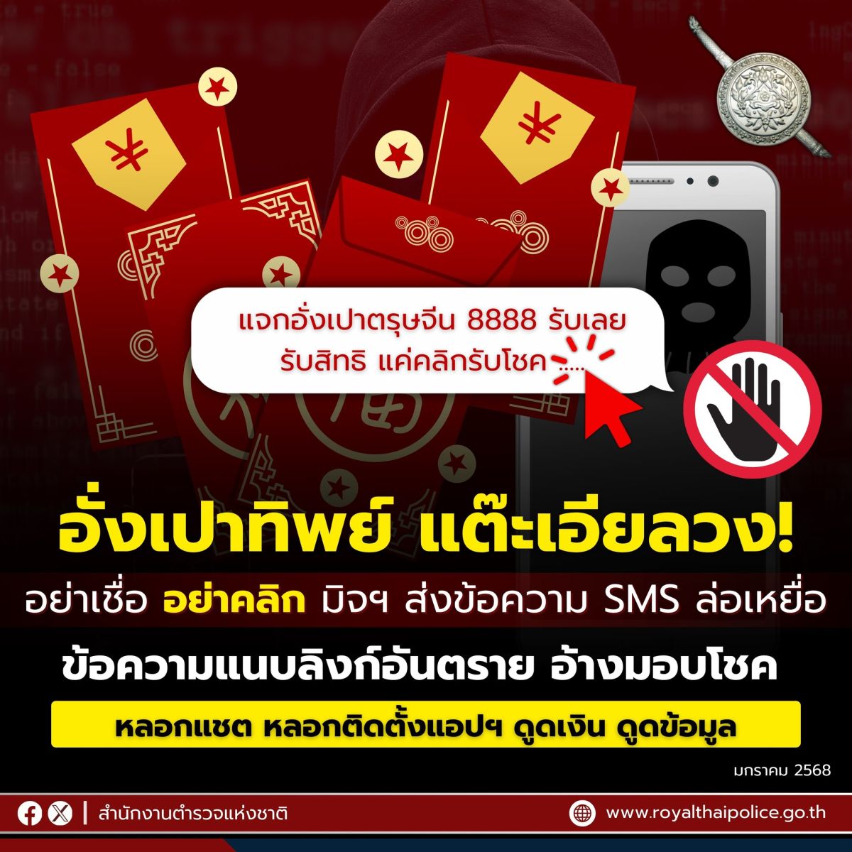 #ตรุษจีน มุกนี้กำลังมา ส่งข้อความ SMS ลวงว่าโชคดี ให้คลิกรับอั่งเปา แต๊ะเอีย หรือสร้างคอนเทนต์ในโซเชียลมีเดียชวนแชตทำกิจกรรมรับโชค ทั้งที่ไม่มีอยู่จริง