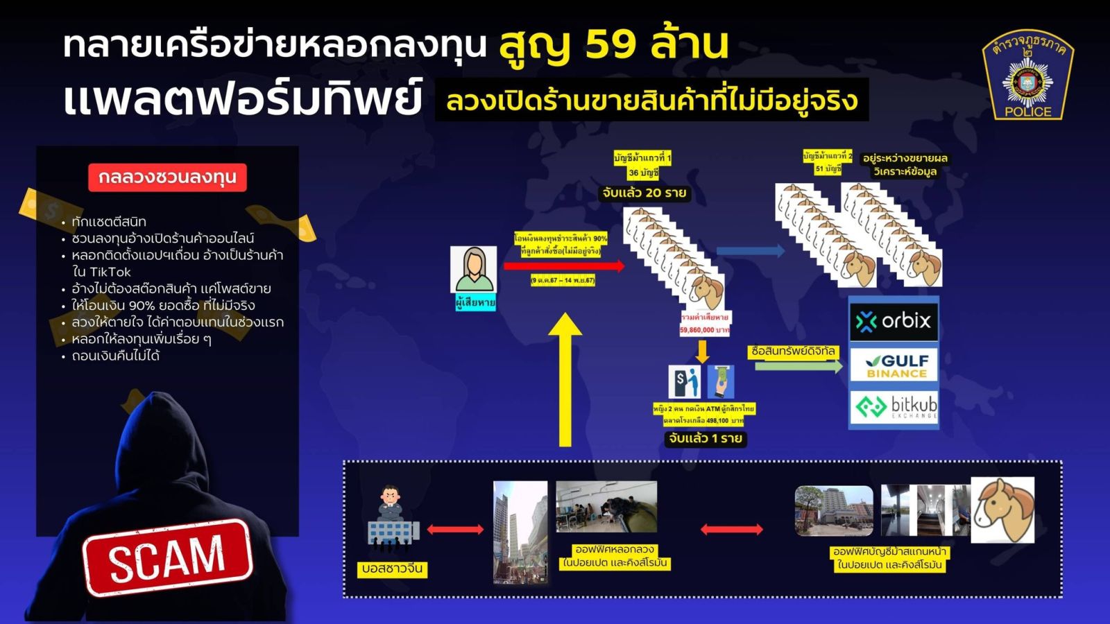 4.มิจฉาชีพอ้างว่าแพลตฟอร์มนี้ขายสินค้าแบบไม่ต้องมีสต๊อก แค่โพสต์ขายก็ได้เงิน อ้างว่าเมื่อมียอดที่ลูกค้าสั่งซื้อ ก็ให้โอนเงินลงทุน 90% ของยอดสั่งซื้อ เมื่อสินค้าถึงมือลูกค้าจะได้กำไรจากส่วนต่าง 10% โดยลวงว่ามียอดสั่งซื้อเข้ามาตลอด ให้เหยื่อทำกิจกรรมโอนเงินเพิ่มเรื่อย ๆ รวม 42 ครั้ง ผ่าน 36 บัญชี รวมเป็นเงินกว่า 59,860,000 บาท