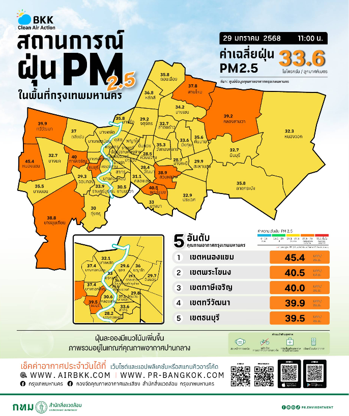 29 มกราคม 2568 เวลา 11:00 น.ศูนย์ข้อมูลคุณภาพอากาศกรุงเทพมหานคร ขอรายงานสถานการณ์ฝุ่นละอองขนาดไม่เกิน 2.5 ไมครอน (PM 2.5) ในกรุงเทพมหานคร