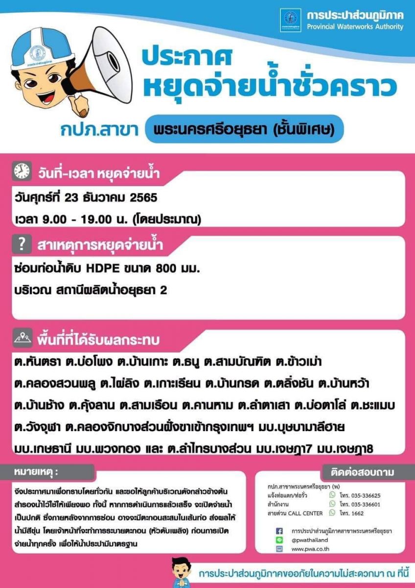 ทั้งนี้ ขอให้ลูกค้าติดตามรายละเอียดพื้นที่ที่ได้รับผลกระทบได้ทางเฟสบุ๊กของ กปภ.สาขาพระนครศรีอยุธยา หรือสอบถามข้อมูลเพิ่มเติมได้ที่ PWA Contact Center 1662 ตลอด 24 ชั่วโมง