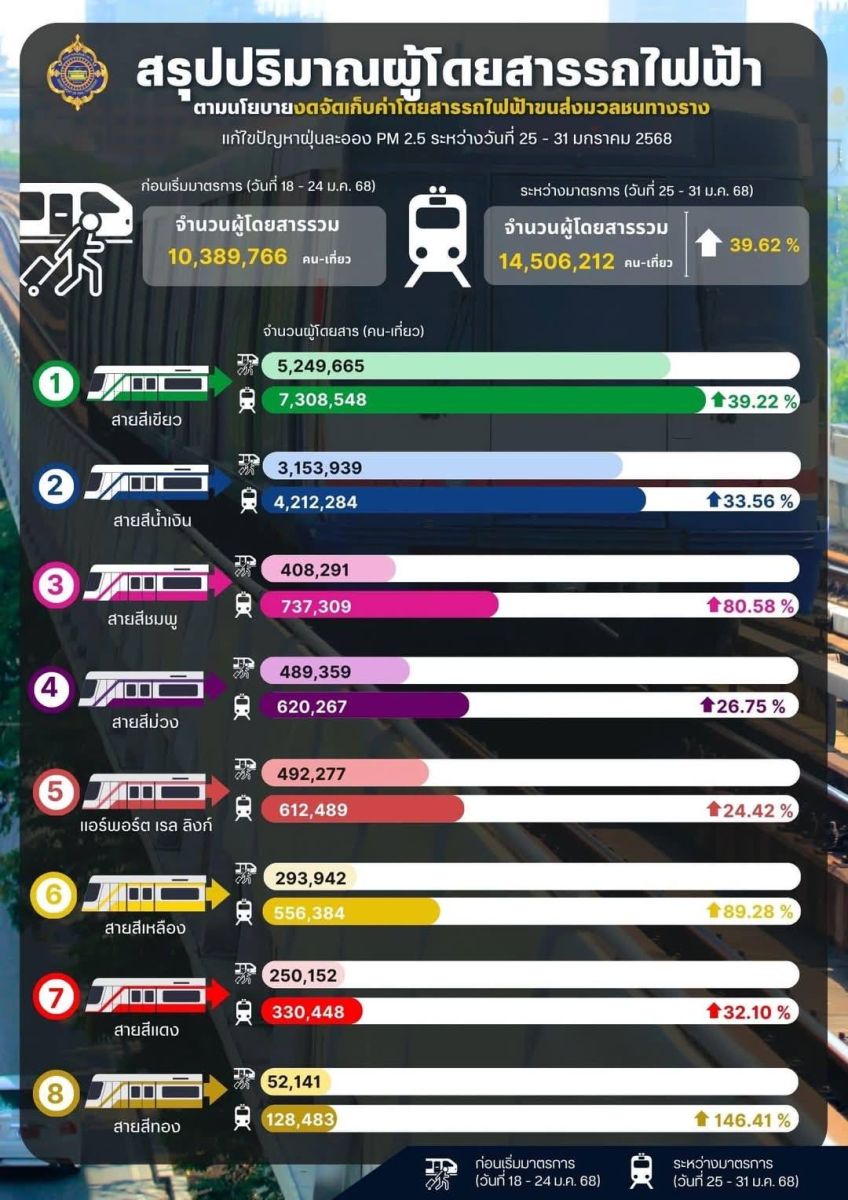 วันนี้ (1 กุมภาพันธ์ 2568) นายพิเชฐ คุณาธรรมรักษ์ อธิบดีกรมการขนส่งทางราง เปิดเผยว่า เมื่อวาน (31 มกราคม 2568) ซึ่งเป็นวันศุกร์สิ้นเดือนมกราคม และเป็นวันสุดท้าย (วันที่เจ็ด) ที่มีมาตรการส่งเสริมให้ใช้บริการขนส่งสาธารณะสำหรับรถไฟฟ้าทุกสายทางและรถโดยสารประจำทางขององค์การขนส่งมวลชนกรุงเทพ (ขสมก.) ฟรี ระหว่างวันที่ 25-31 มกราคม 2568 รวม 7 วัน เพื่อช่วยลดฝุ่นละออง PM 2.5 ที่เกิดจากยานพาหนะในเขตกรุงเทพมหานครและปริมณฑลตามข้อสั่งการของนางสาวแพทองธาร ชินวัตร นายกรัฐมนตรี ทั้งนี้พบว่ามีผู้ใช้บริการระบบรถไฟฟ้ารวมทั้งสิ้น 2,420,999 คน-เที่ยว สูงสุดตั้งแต่มีสถานการณ์ Covid- 19 (นิวไฮ) โดยมีผู้โดยสารเพิ่มขึ้น 716,799 คน-เที่ยว หรือเพิ่มขึ้นร้อยละ 42.06 เมื่อเทียบกับค่าเฉลี่ยวันศุกร์ในสามสัปดาห์ของเดือนมกราคม 2568 ที่ผ่านมา (ค่าเฉลี่ยฯ 1,704,200 คน-เที่ยว) และเพิ่มขึ้นอย่างต่อเนื่อง ซึ่งมีผู้ใช้บริการรถไฟฟ้ามากกว่าวันพฤหัสบดี (30 มกราคม 2568) จำนวน 89,465 คนเที่ยว หรือเพิ่มขึ้นร้อยละ 3.84 โดยมีรายละเอียด ดังนี้