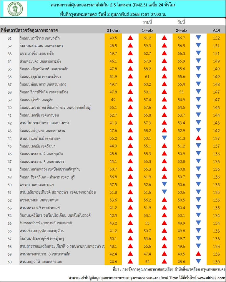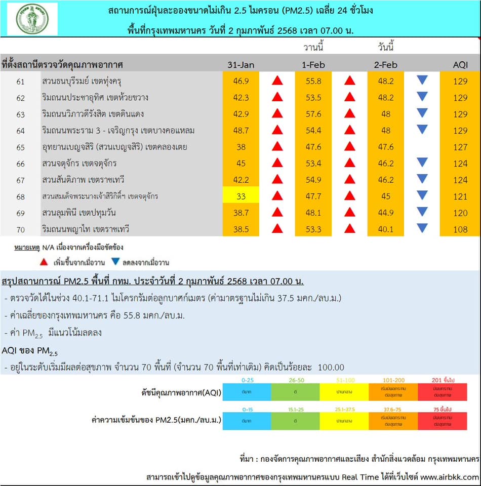ศูนย์ข้อมูลคุณภาพอากาศกรุงเทพมหานครขอสรุปผลการตรวจวัด PM2.5 ประจำ วันที่ 2 กุมภาพันธ์ 2568เวลา 05.00-07.00 น. (3 ชั่วโมงล่าสุด) วันนี้คุณภาพอากาศระดับสีส้ม: เริ่มมีผลกระทบต่อสุขภาพ