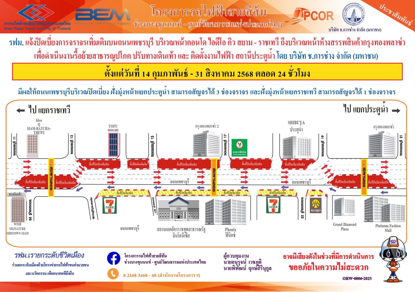 การรถไฟฟ้าขนส่งมวลชนแห่งประเทศไทย (รฟม.) แจ้งว่า บริษัท ช.การช่าง จำกัด (มหาชน) ผู้รับจ้างออกแบบและก่อสร้างอุโมงค์ทางวิ่งและสถานีใต้ดิน โครงการรถไฟฟ้าสายสีส้ม ช่วงบางขุนนนท์ - ศูนย์วัฒนธรรมแห่งประเทศไทย มีความจำเป็นต้องปิดเบี่ยงจราจรเพิ่มเติม บนถนนเพชรบุรี ฝั่งมุ่งหน้าแยกประตูน้ำ เพื่อดำเนินงานรื้อย้ายสาธารณูปโภค ปรับทางเดินเท้า และติดตั้งงานไฟฟ้า สถานีประตูน้ำ ตั้งแต่วันที่ 14 กุมภาพันธ์ - 31 สิงหาคม 2568 ตลอด 24 ชั่วโมง โดยมีรายละเอียด ดังนี้